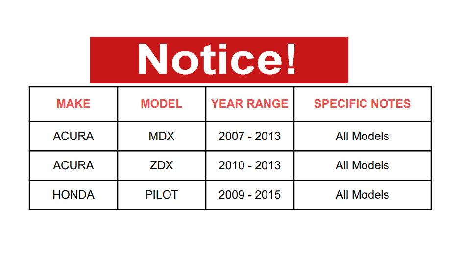 | ACURA | ZDX | 2010 - 2013 | All Models |