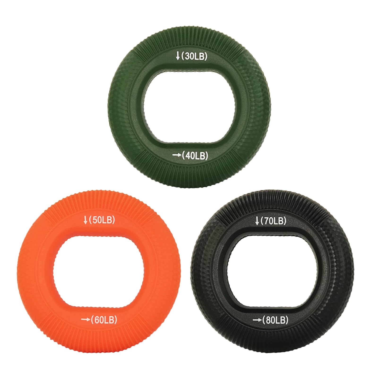 💪 SAFE & DURABLE HAND GRIP STRENGTHENER. Pack of 3 grip strength trainer rings hand strengthening devices in 6 levels of progression: 30/40/50/60/70/80 LB resistance. The hand exercisers are made of high quality silicone, they are odorless, non-toxic, hypoallergenic, safe and comfortable to use, and easy to clean.