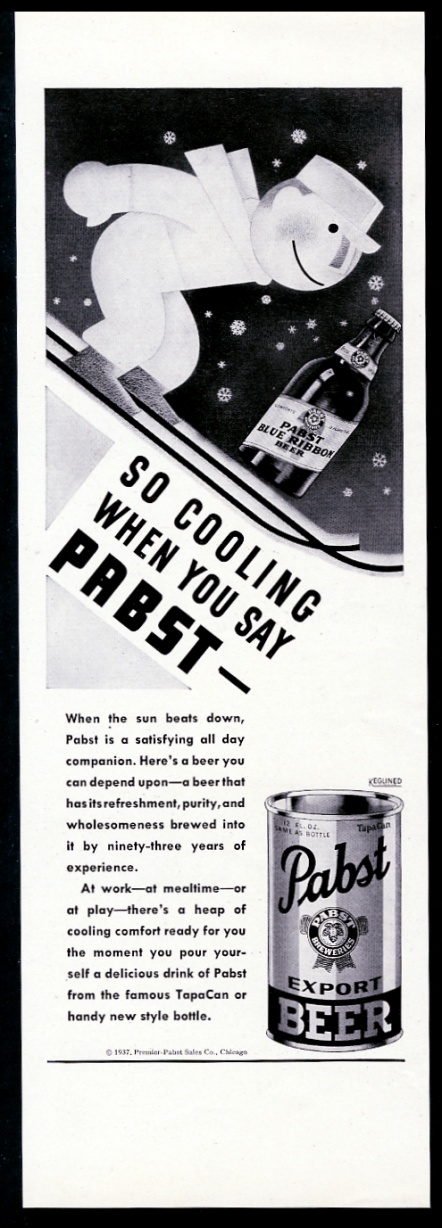 1939 art nouveau skiiing skier Pabst Blue Ribbon Beer vintage print ad