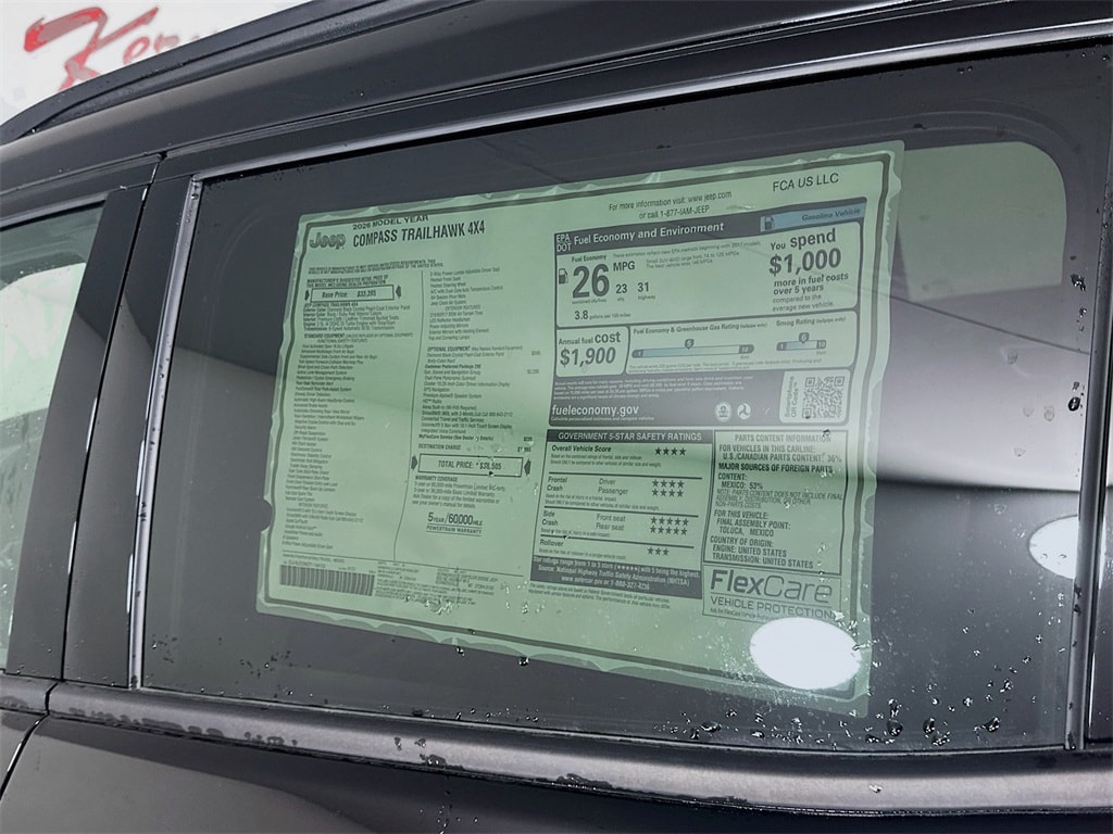 MORE ABOUT THIS 2026 Jeep Compass Trailhawk SUV LEATHER HEATED SEATS! SUNROOF! NAVIGATION! REMOTE START! BACKUP CAMERA! This 2026 JEEP COMPASS TRAILHAWK 4X4 SUV includes the following features: Package: 29E , Exterior Color: Diamond Black Crystal Pearl Coat Exterior Paint , Interior Color: Black / Ruby Red Premium Cloth / Leather Trimmed Bucket Seats , Engine: 2.0L I4 DOHC DI Turbo Engine with Stop/Start , Transmission: 8 Speed Automatic 8F30 Transmission , Full Speed Forward Collision Warning Plus , Blind Spot and Cross Path Detection , Active Lane Management System , Hill Start Assist , Hill Descent Control , Electronic Stability Control , Electronic Roll Mitigation , Uconnect 5 with 10.1 Inch Touch Screen Display , Apple CarPlay , Google Android Auto , Heated Front Seats , Heated Steering Wheel , As well as the following options: GPS Navigation , Alexa Built In (Wi Fi Required) , Connected Travel and Traffic Services , Uconnect 5 Nav with 10.1 Inch Touch Screen Display , Integrated Voice Command , and much more! Please check the window sticker for a complete list of equipment. Kernersville Chrysler Dodge Jeep Ram in Kernersville, NC is located in the heart of North Carolina between Charlotte, NC and Raleigh, NC. We specialize in NO hassle out of state purchases we process your taxes, tags and title work for the city and state where the vehicle will be registered. RETURN TO TOP