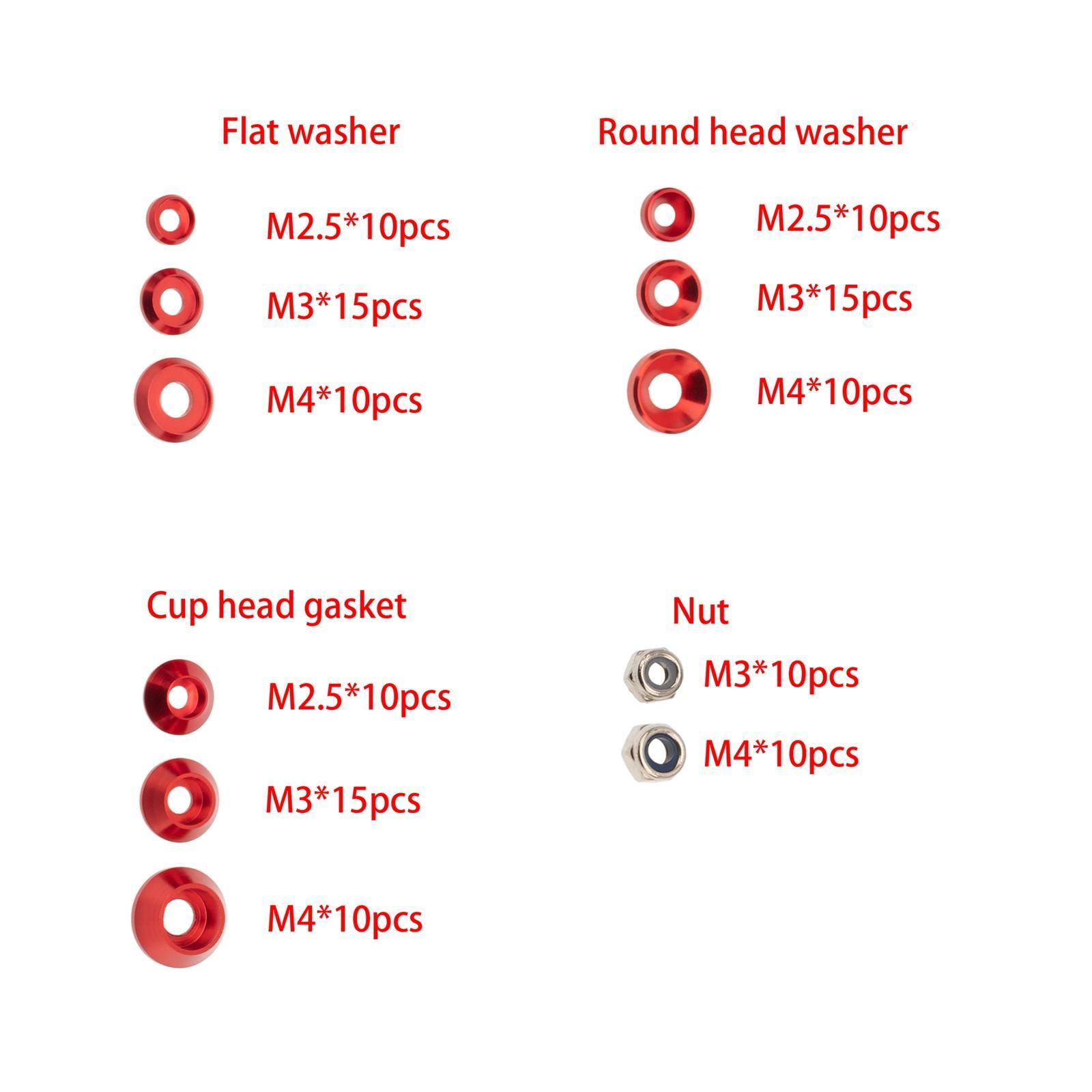 M2.5 countersunk head, round head, 10pcs of each; M3 countersunk head, round head, 15pcs of each; countersunk head, round head, 10pcs of each; M3 nut 10pcs of each, Total 125pcs.