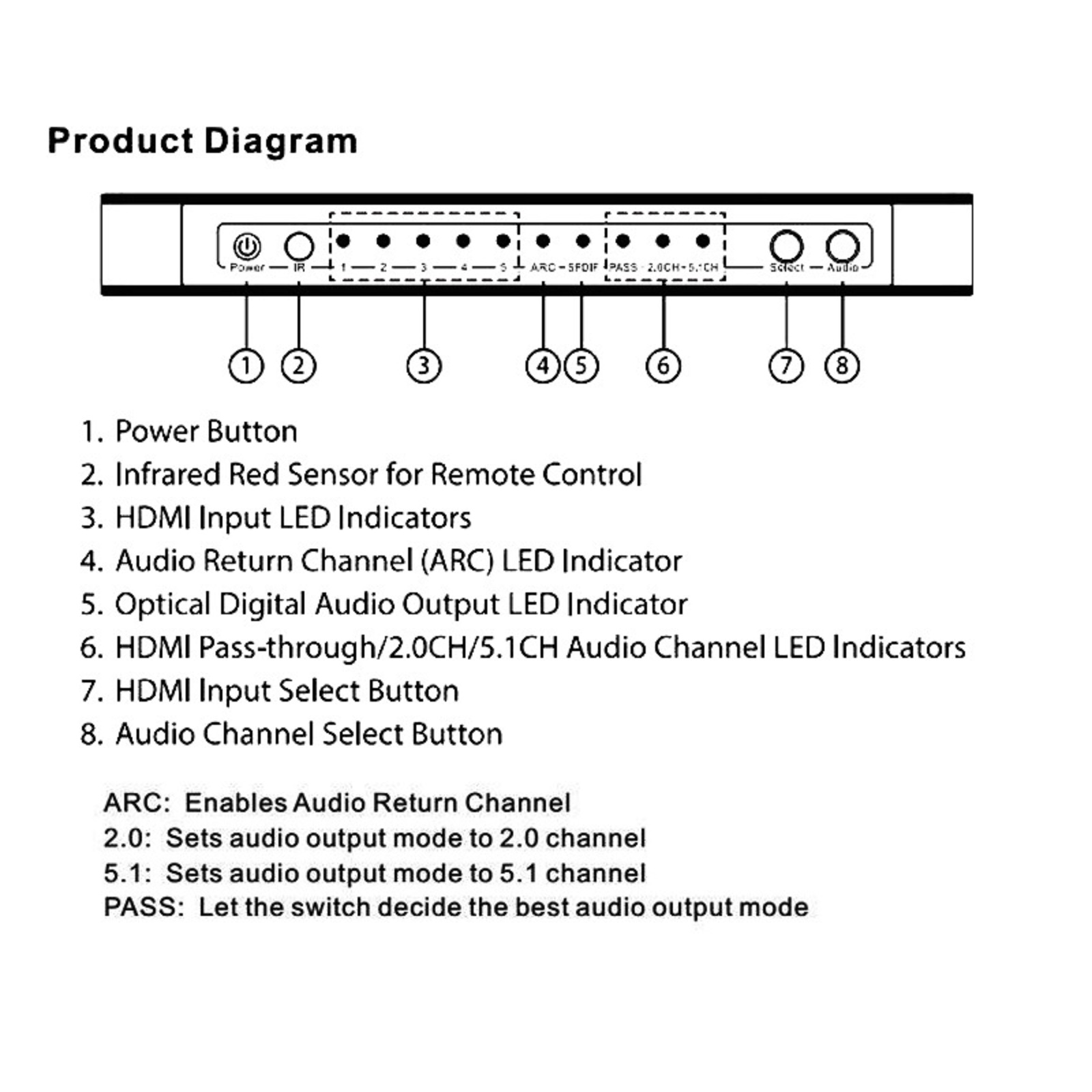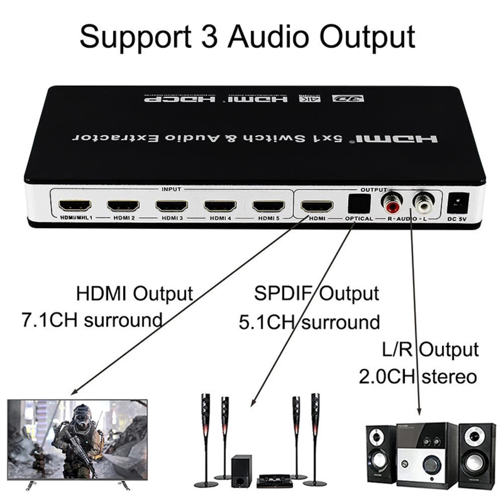 Supports up to 5.1CH digital surround on HDMl or Toslink output.Supports up to 2.0 channel analog stereo on Stereo output.