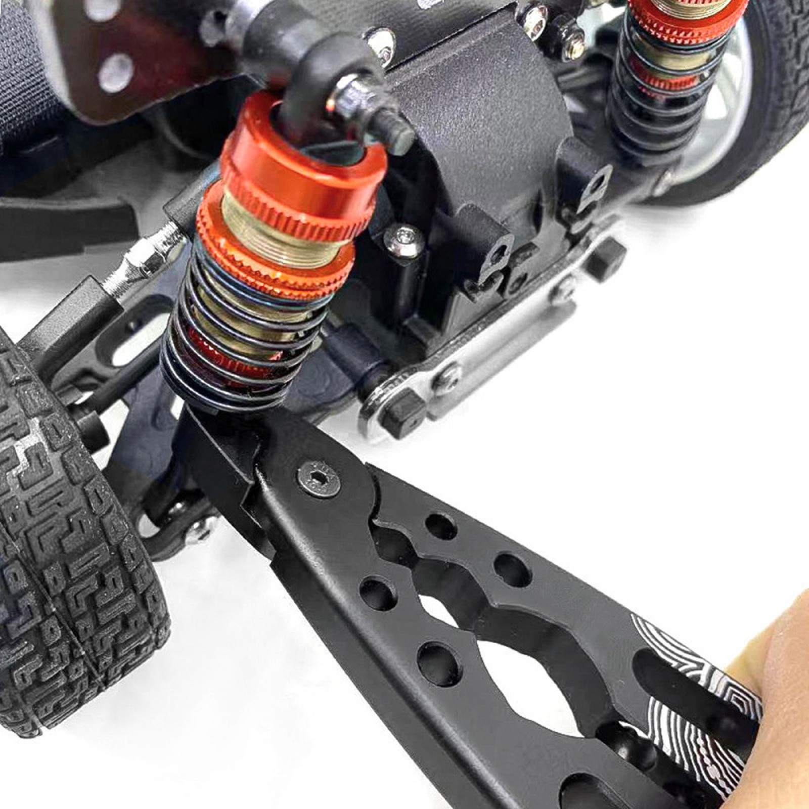 It has a variety of functions such as 2-3mm and 3-4mm shock absorber shaft fixing, 1/10 and 1/8 model shock absorber barrel fixing, 4 and 5mm welding holes, and engine cylinder liner fixing
