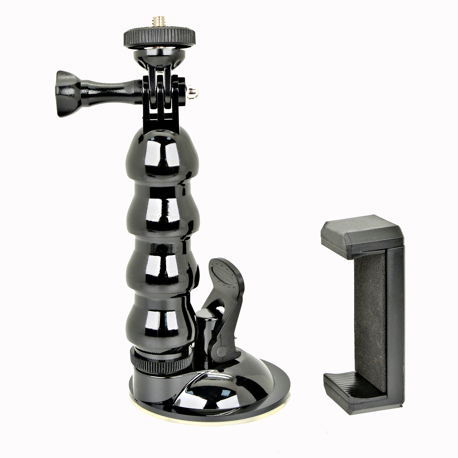 Suction cup makes the holder attach to a wide range of surfaces.