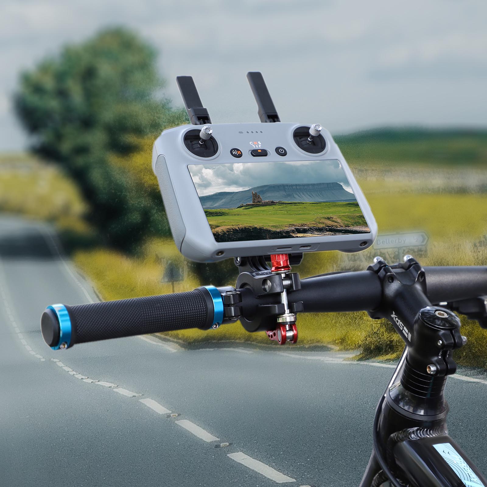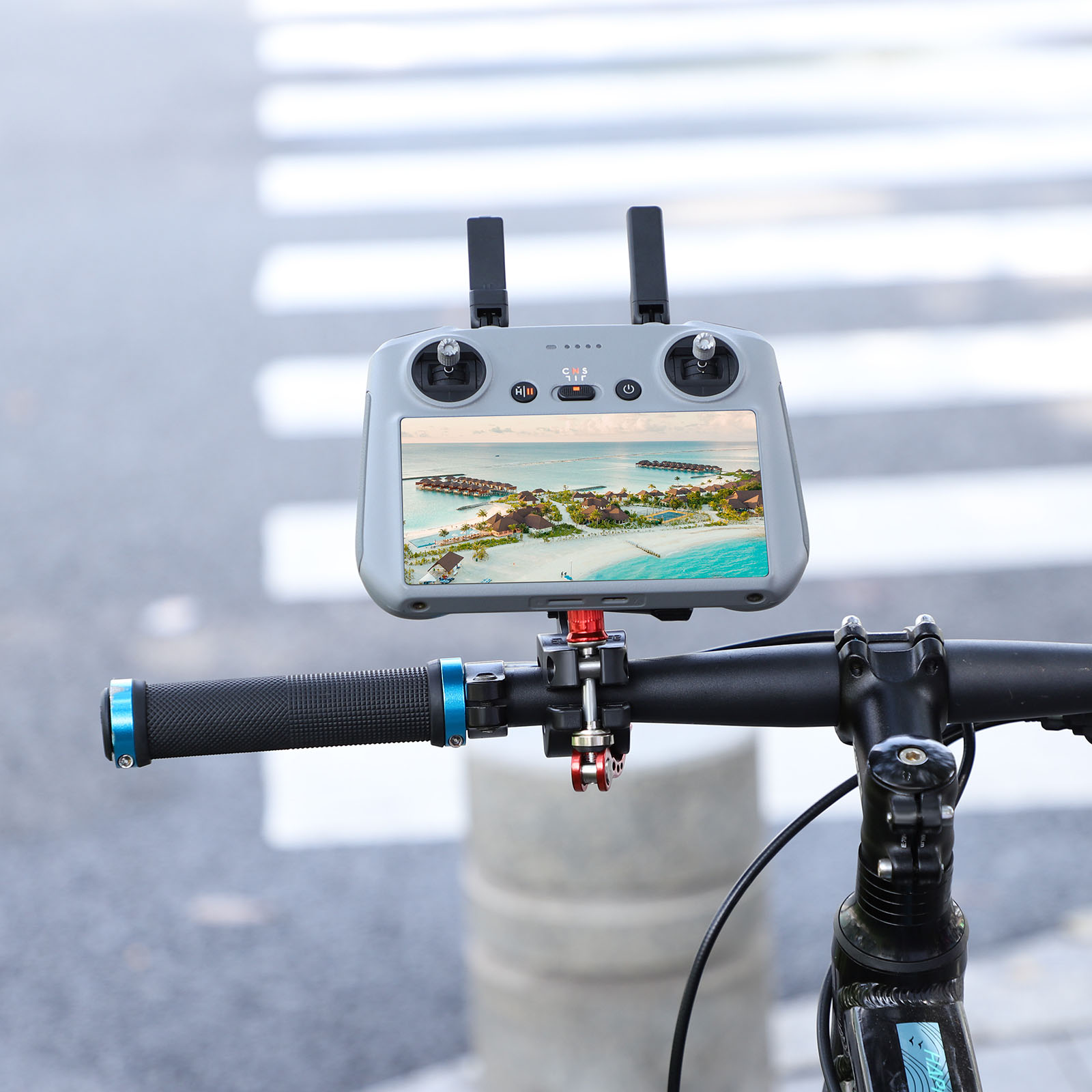 When following photos during outdoor cycling, the for DJI RC 2 remote control can be fixed to the handlebar and operated while cycling.