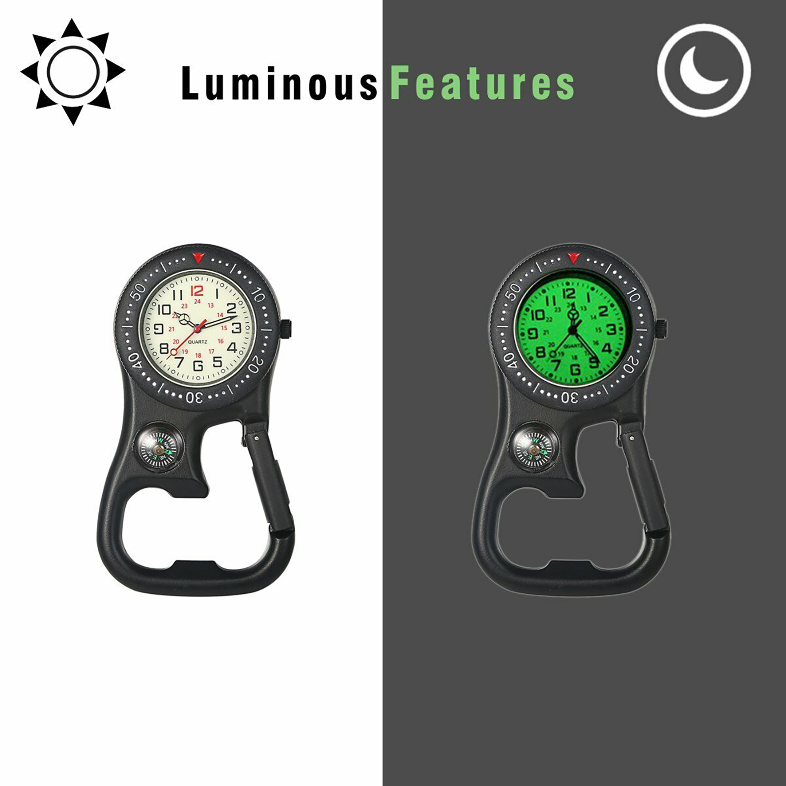Suitable for various outdoor activities such as hiking, camping, and climbing, this clip-on carabiner watch is a versatile and practical accessory