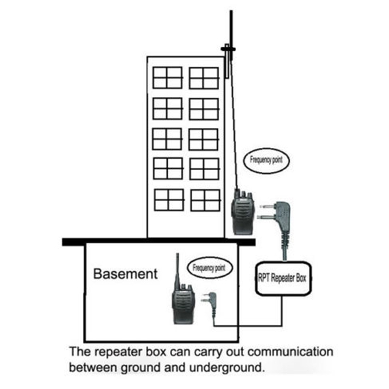 Handheld radios used currently on the market for basic use rate in 400-470MHz, most of the power 5W, this walkie talkie in open call distance can reach 5-8 km, while in dense urban, but only a short distance of 1-2 km, or less. In order to have long-distance communication, we need a repeater. Standard repeaters have a high cost, and can be complicated to install, so there was a need for a simple and inexpensive repeater. The operation is very simple, and no power supply needed, You do not need to change any part of the radio, All you need is just two handheld radios and connect the cables to the external mic/spk ports (2.5mm&3.5mm). using two handheld walkie talkie headset jack is composed of a very practical small relay station through the relay box.