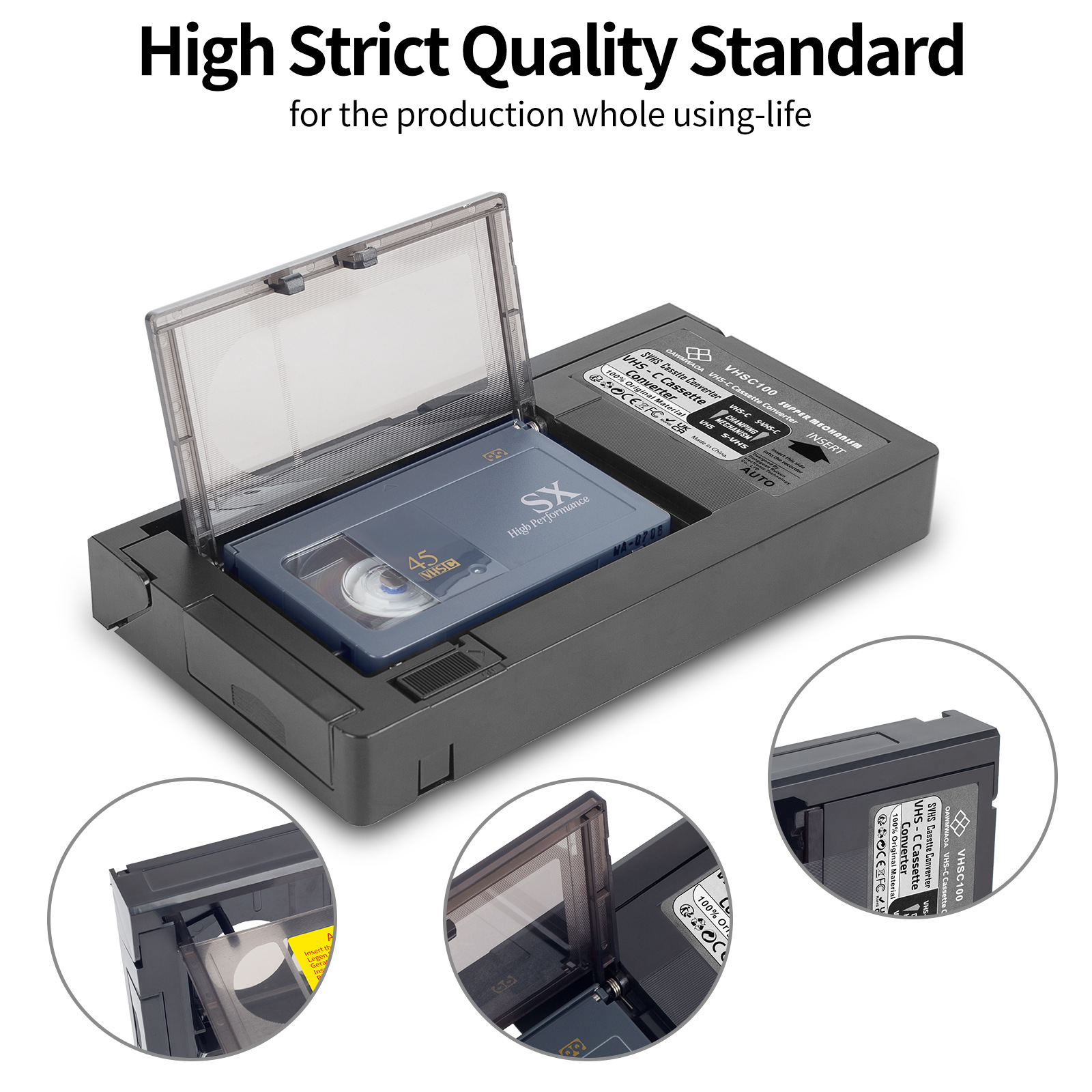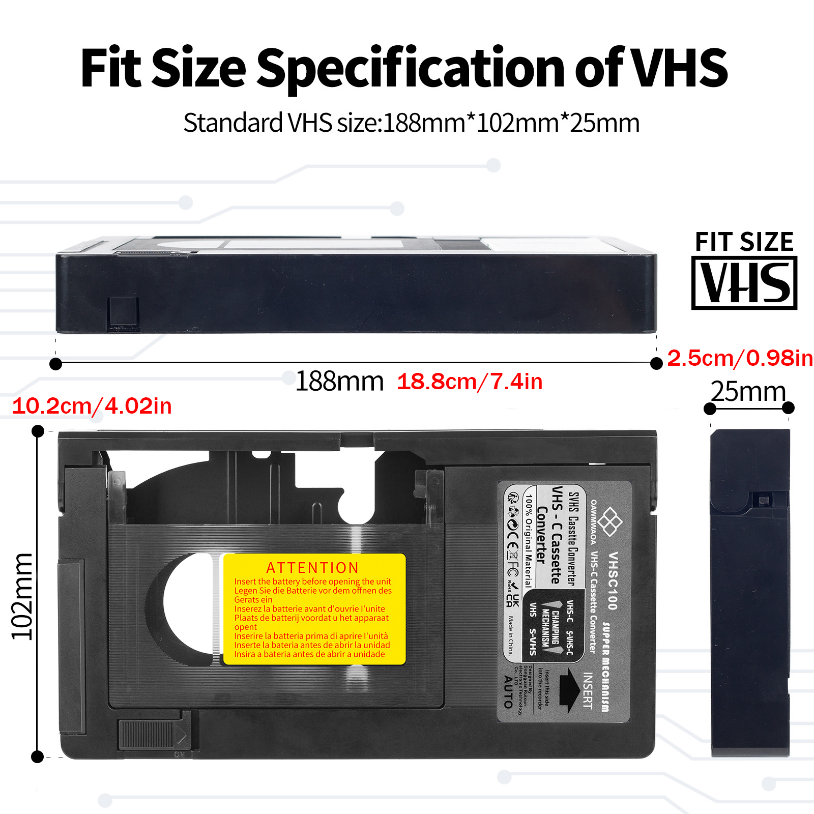 By using this converter box, you can use a VHS VCR to play back VHS-C or SVHS-C tapes
