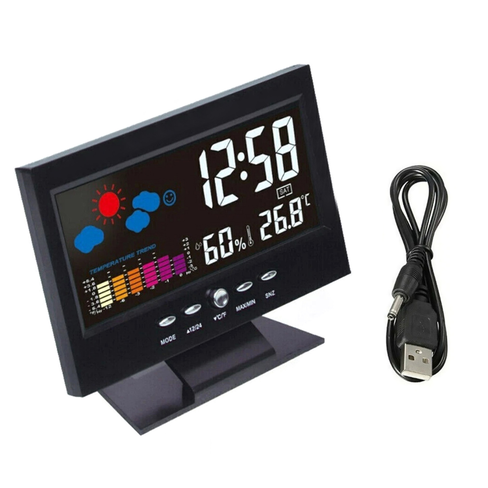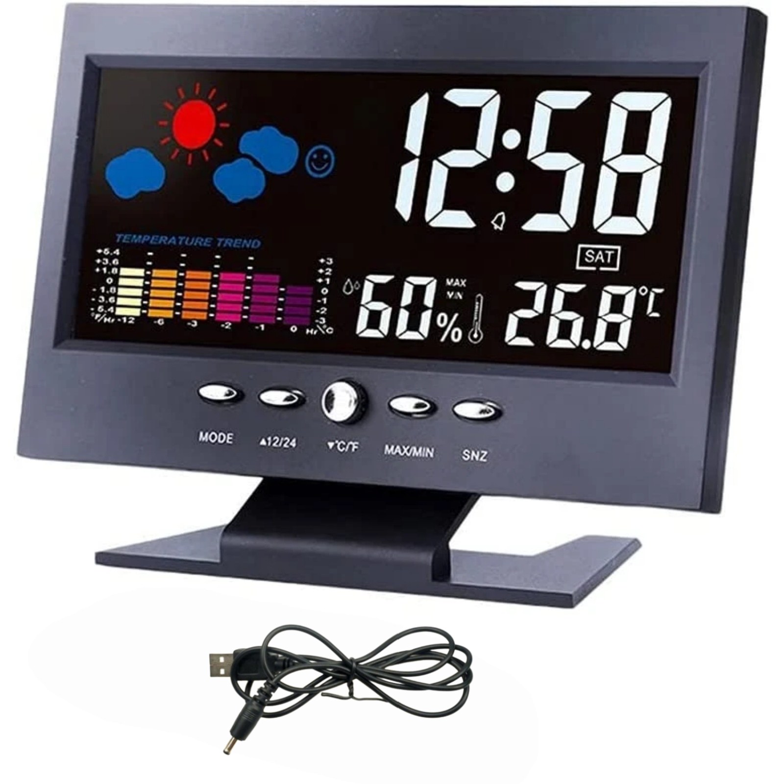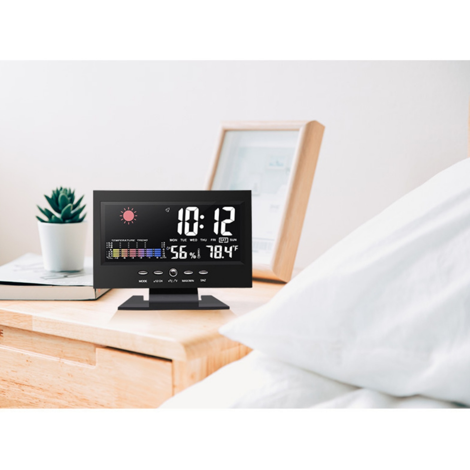 All-in-One Design: Color LCD screen, can be used as an alarm clock, showing time, date, day of the week, temperature, humidity trends, weather display, perpetual calendar.