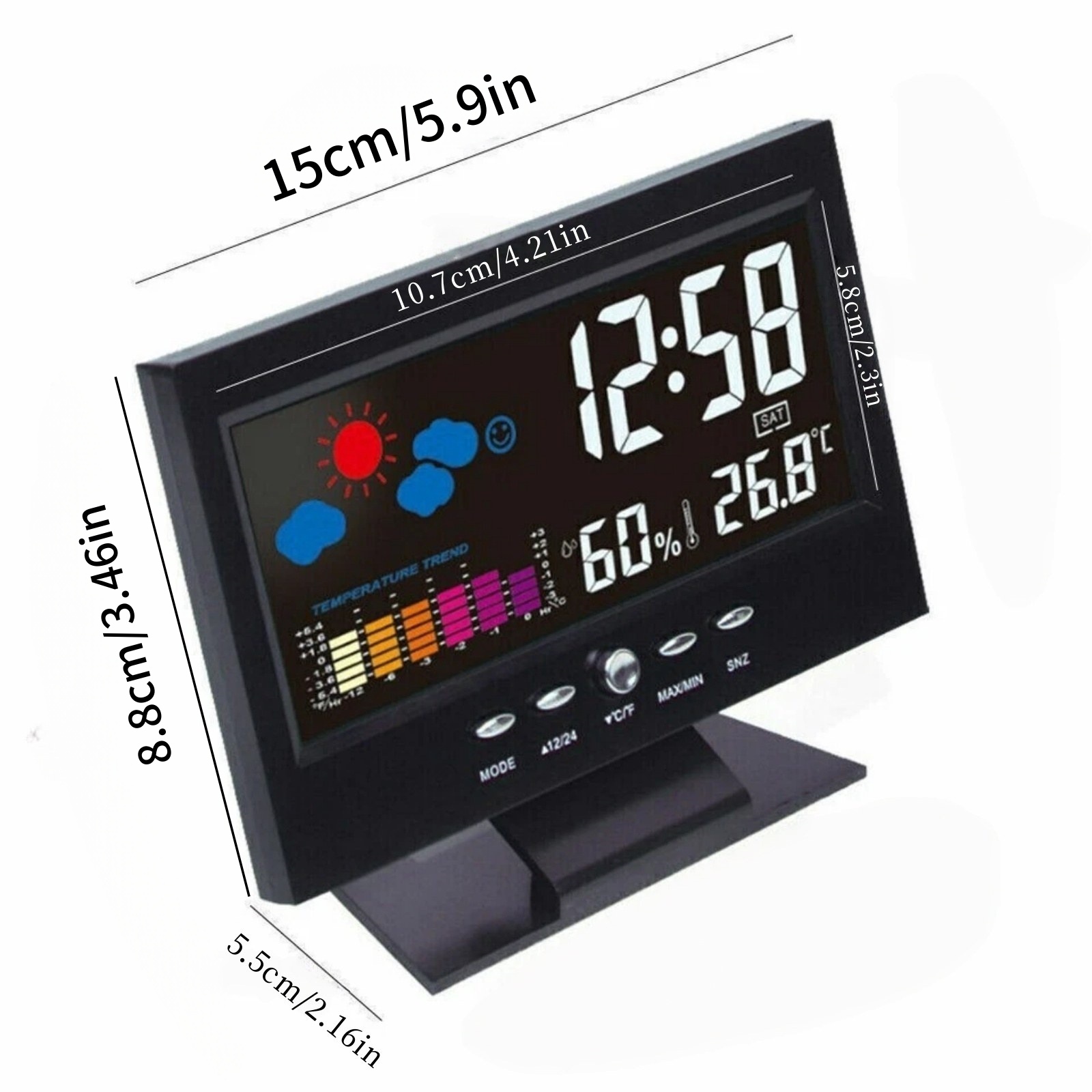 Feature: This clock including 12/24 hours switching, alarm clock function, high clarity screen, humidity/temperature measurement, time/week display, voice-controlled backlight, weather forecast and so on.