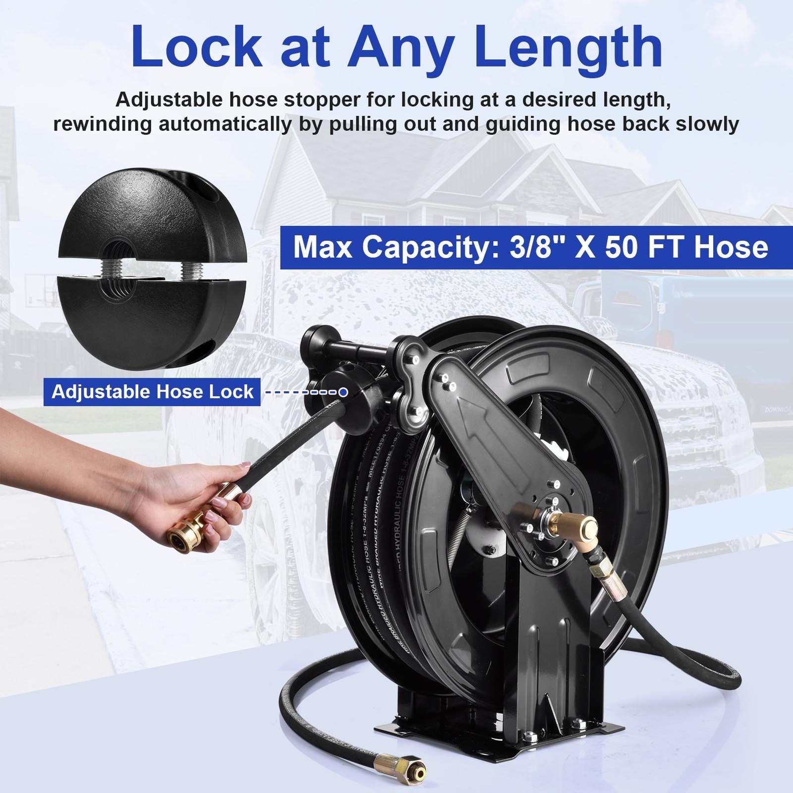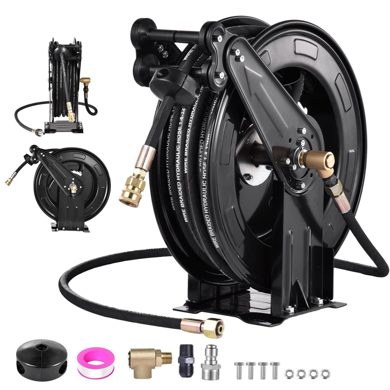 Easily store your pressure washer hose with our Automatic Retractable Hose Reel. Its rust-resistant design simplifies usage and storage, ideal for factory workshops, garages. Compatible with most pressure washers, enjoy easy hose management in any setting.