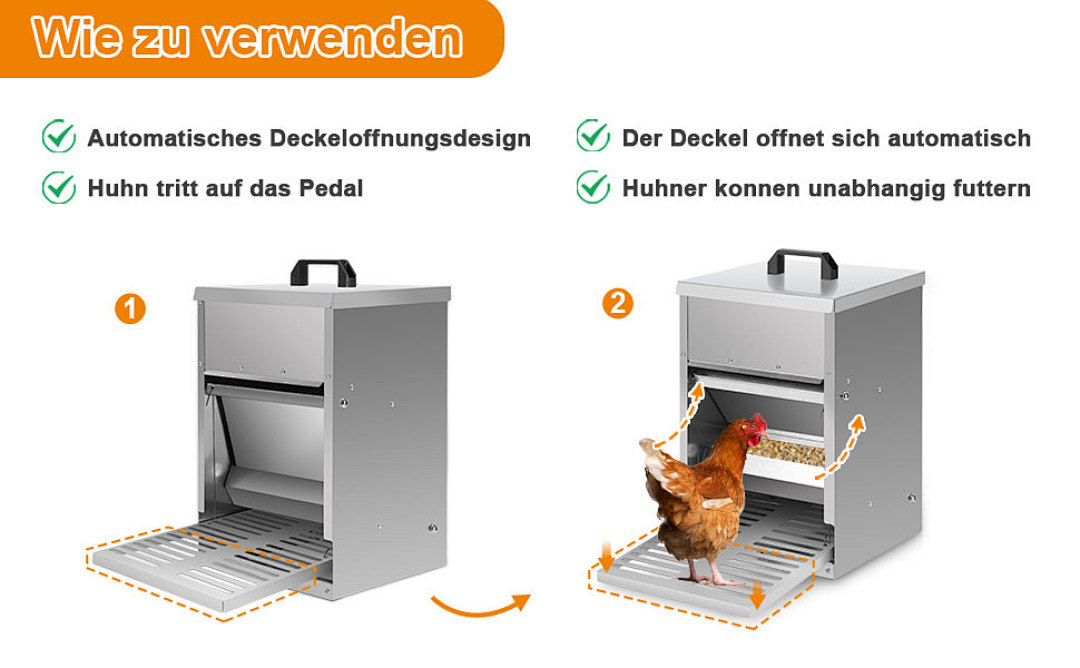 Der automatische Futterspender gewährleistet Sauberkeit, indem er Futter nur dann freigibt, wenn das Geflügel aktiv auf das Pedal tritt. So bleibt das Futter geschützt und sauber, während Ihre Tiere in einer gesunden Umgebung gefüttert werden.