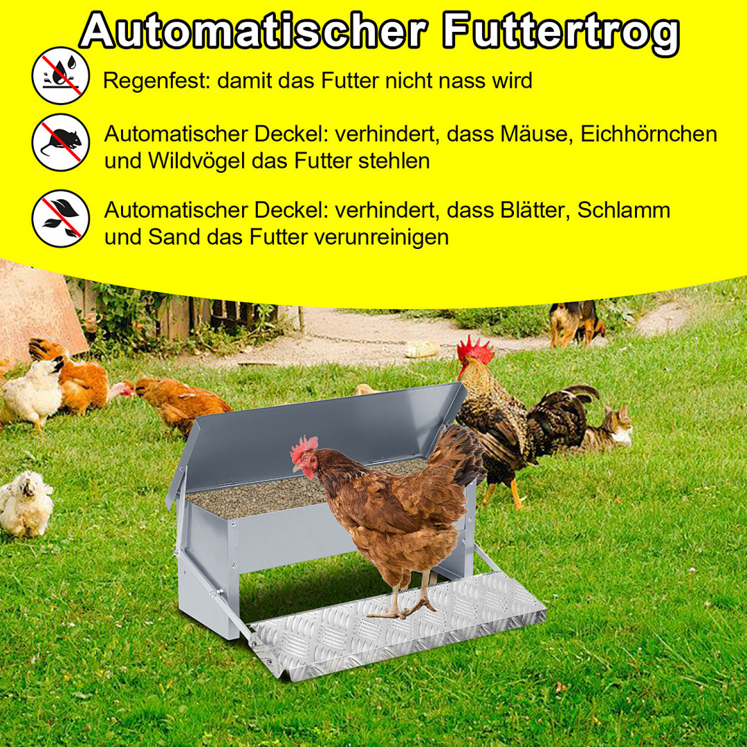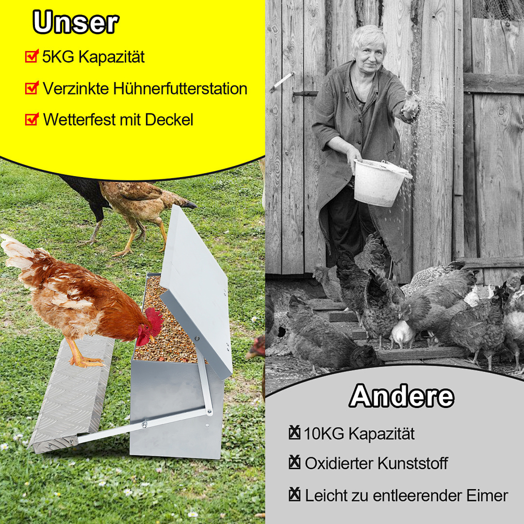 Hergestellt aus korrosions- und wasserbeständigem, verzinktem Stahl, ist der Futterspender ideal für den Einsatz im Freien geeignet. Das abgedeckte Design schützt das Futter zuverlässig vor Schädlingen wie Mäusen, Vögeln und anderen Tieren.