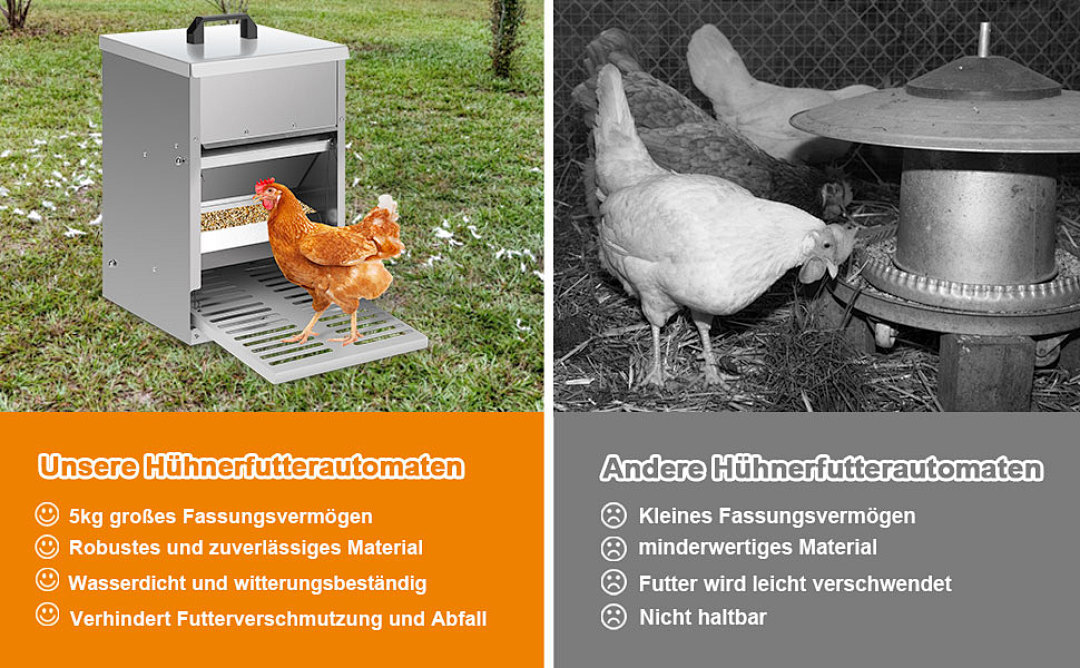Mit einem Fassungsvermögen von 5 kg reduziert der Futterspender den Arbeitsaufwand erheblich – perfekt für große oder vielbeschäftigte Farmen. Einfach den Deckel abnehmen, nachfüllen und Zeit sparen!