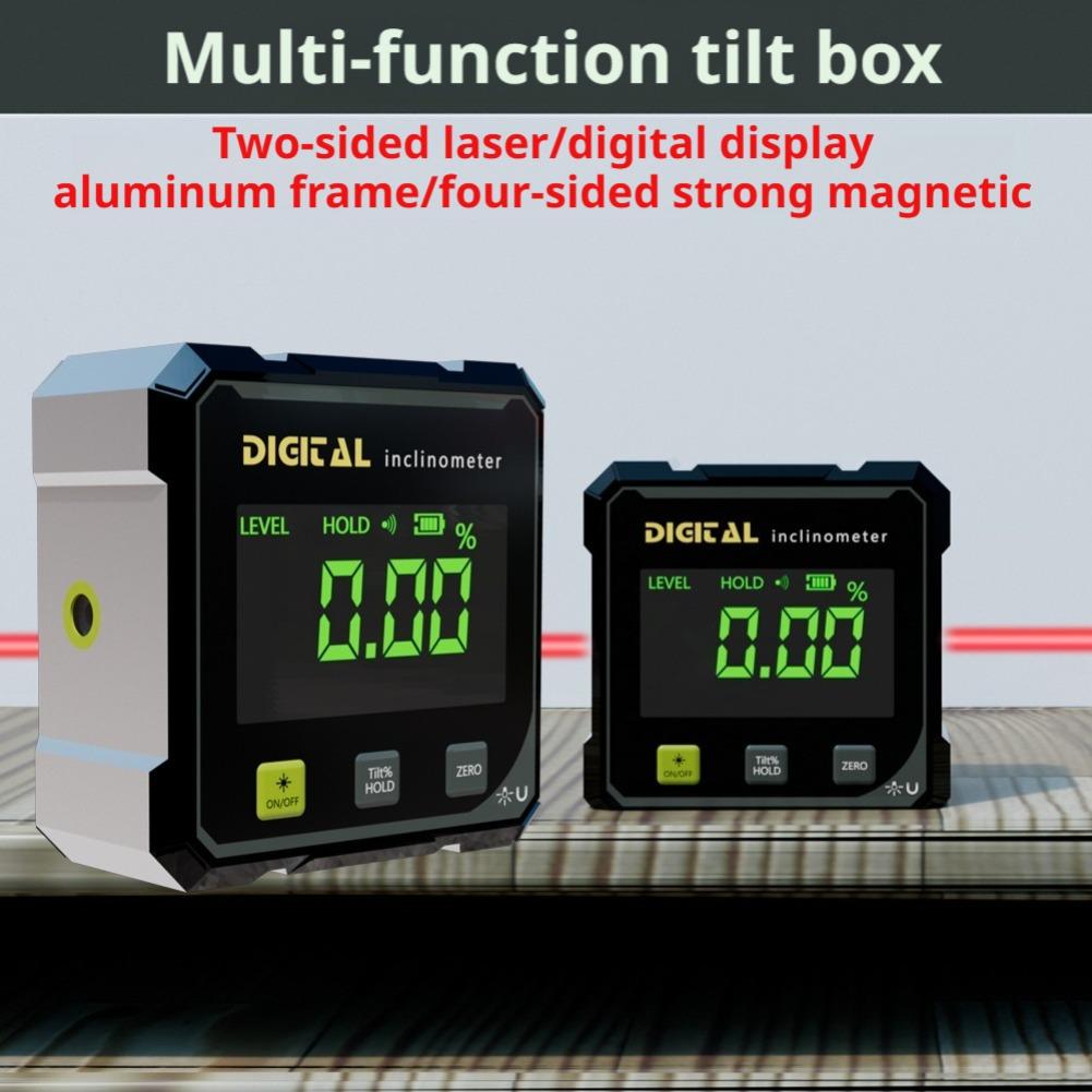 Functions: Angle and slope switching, Relative/absolute measurements, Dual-laser reset, Auto shutdown (3 mins), Data Lock