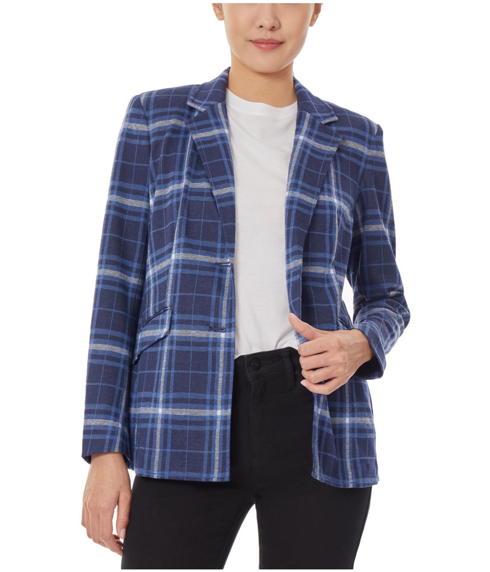 Jones New York Womens Knit Stretch Plaid Two Button Blazer Jacket, navy, M
