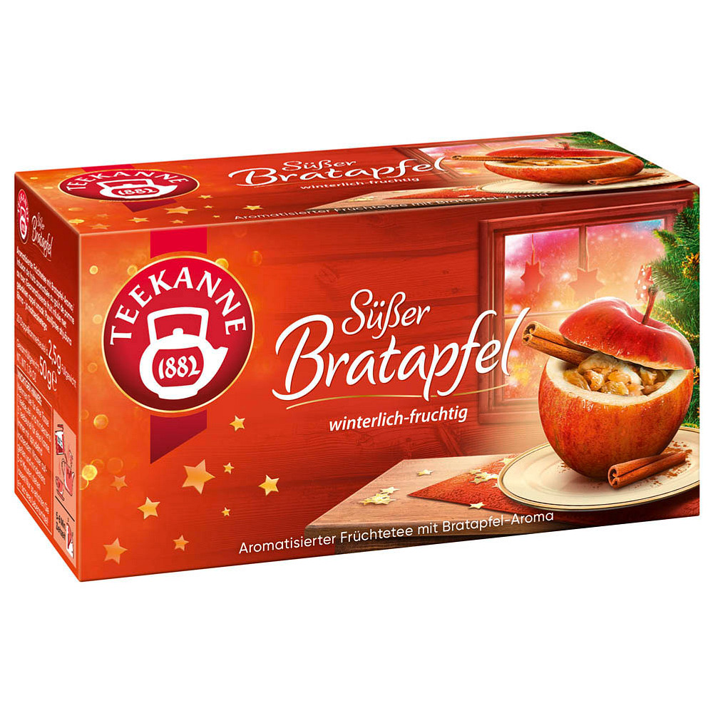 Mit dem herrlichen Früchtetee Süßer Bratapfel von TEEKANNE mit würzig-fruchtigem Bratapfelgeschmack erleben Sie den Winter und die Advents- und Weihnachtszeit noch intensiver. Schließen Sie die Augen und genießen Sie den Duft von Vanille, Zimt, gebrannten Mandeln, Orangen oder Spekulatius. Es ist, als würden Sie über einen Weihnachtsmarkt spazieren. Nehmen Sie für eine Tasse Tee einen Teebeutel. Mit sprudelnd kochendem Wasser aufgießen und mindestens 5-8 Minuten ziehen lassen. In einer Packung befinden sich 20 einzeln verpackte Tee-Aufgussbeutel à 2,5 g. Die Teebeutel sollten am besten vor Wärme geschützt und trocken lagern werden.