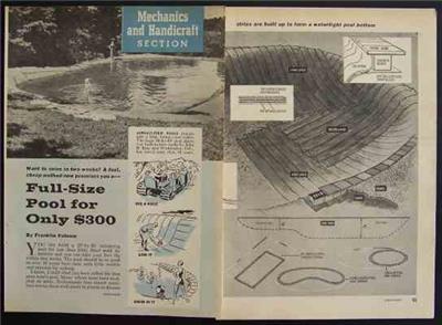 Plans to build a In-ground Pool. Details on making a low cost pool using roll roofing. Can be built in almost any shape or size you want. Small ponds have been built using this method. Many of these pools have lasted many years with only minimal maintenance.