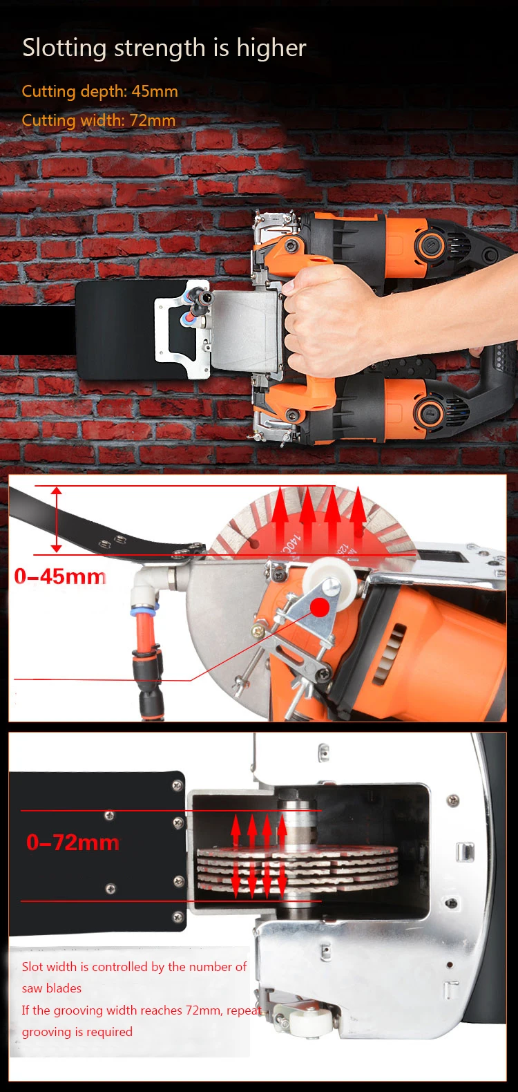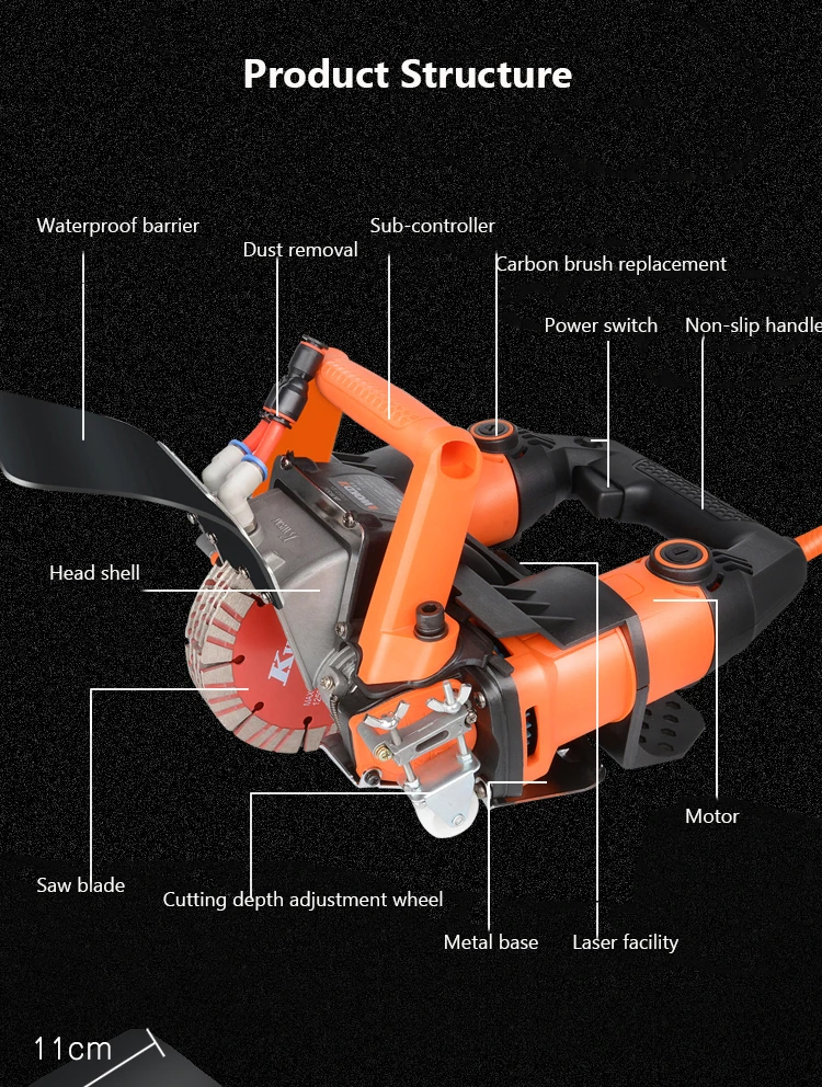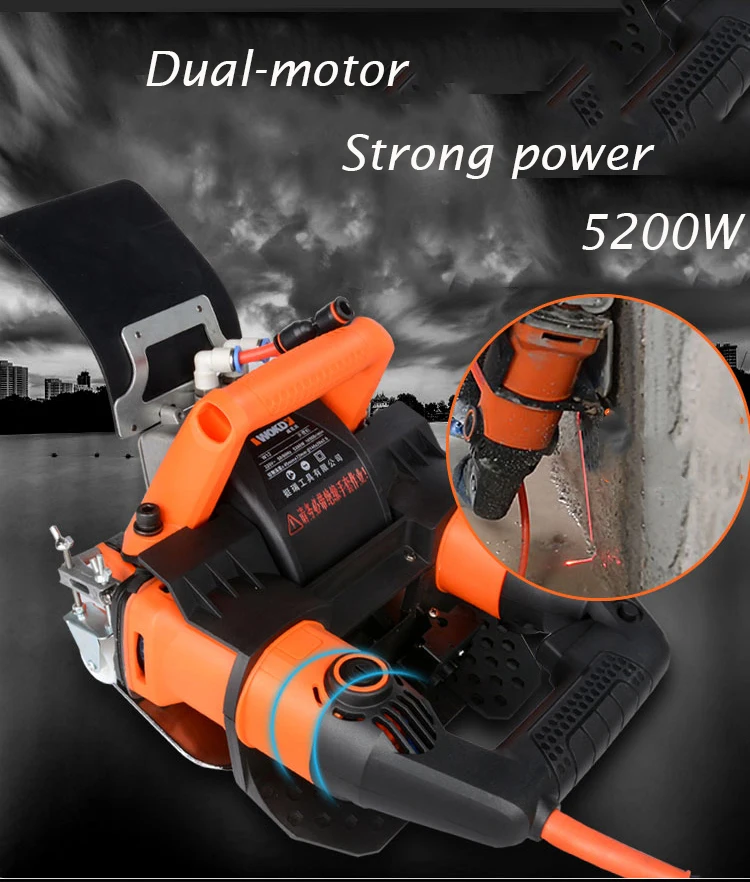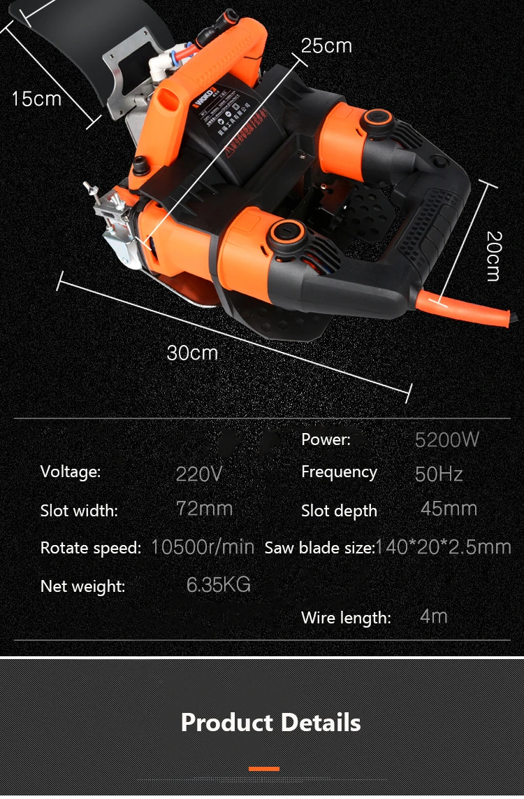Power: 5200W Speed: 10500r/min Notching depth: 45mm Slot width: 72mm Machine weight (excluding saw blade): 6.35kg Wire: 4m