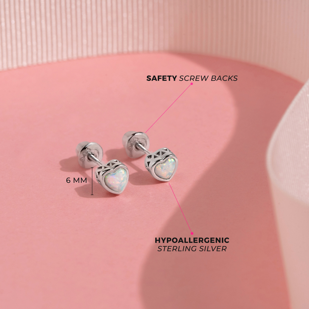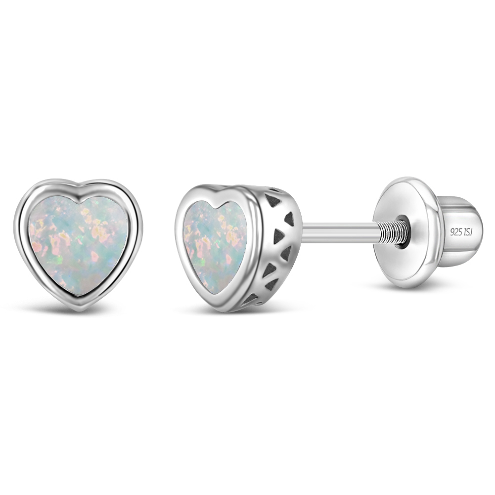 These adorable October simulated opal heart earrings for toddlers and the cutest heart shaped earrings for a little girl. This beautiful pair of screw back earrings feature a lovely simulated opal birthstone at its center. Crafted entirely of 925 sterling silver, is is hypoallergenic, making it safe for sensitive ears. They feature threaded posts and a safety screw back system to ensure your child's earrings stay comfortably in place. These toddler & young girl earrings make a sweet gift for any October birthday girl. Complimentary gift box is included for easy giving!