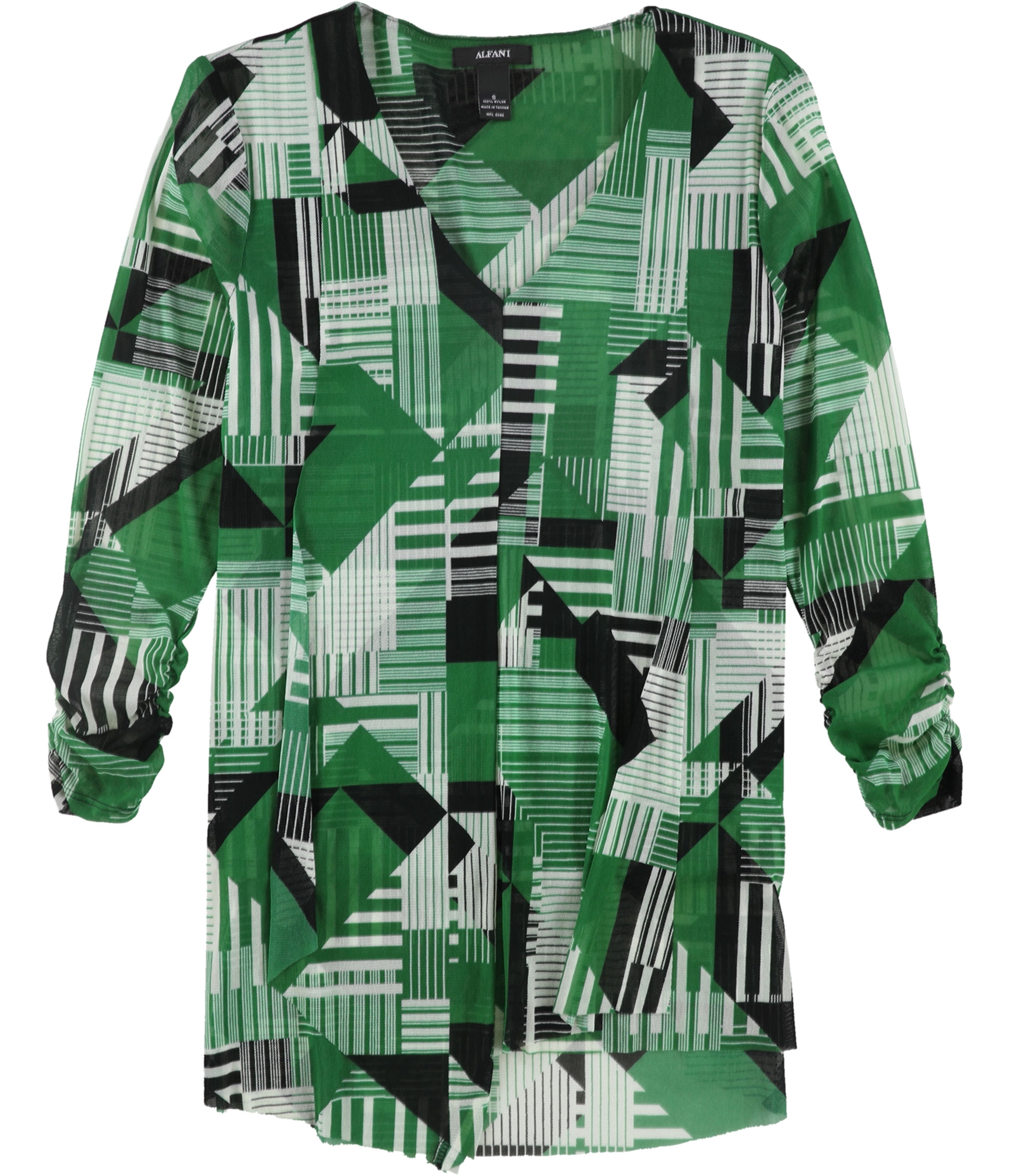 Style Number: 100011911 Gender: Womens Country of Manufacture: Taiwan Collar Style: Collarless Fit: Not Specified Material: 100% Nylon Features: Asymmetrical Pattern: Geometric Season: All Seasons Density: Medium Weight Sleeve Length: 3/4 Sleeve Occasion: Casual Theme: Modern