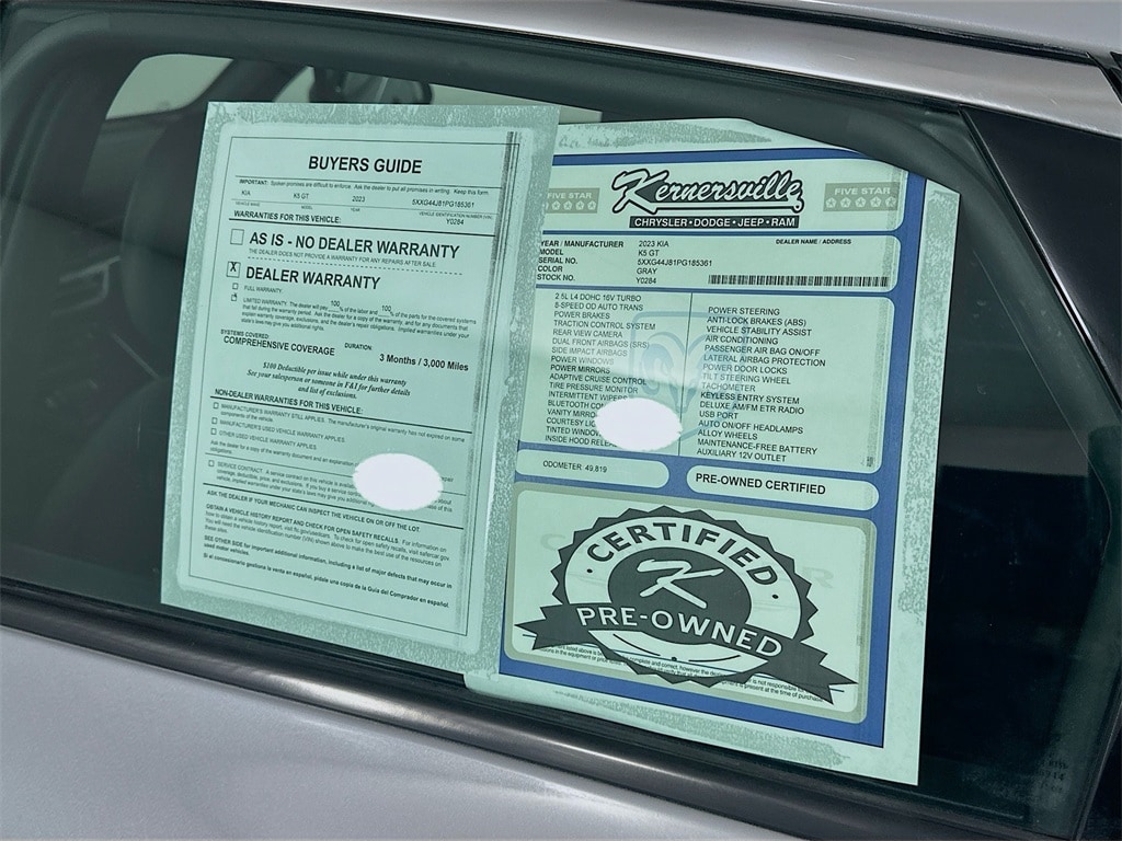 When calling or emailing, please reference stock number Y0284.MORE ABOUT THIS 2023 Kia K5 GT SedanCertified Pre Owned! Clean Carfax! One Owner! GT Performance Trim! Turbocharged Performance! Dual Clutch Automatic Transmission! Sport Tuned Suspension! Smart Cruise Control With Stop And Go! Highway Driving Assist! Surround View Monitor! Blind Spot Monitoring! Forward Collision Avoidance Assist! Parking Distance Warning Front And Rear! Power Folding Mirrors With Turn Signals! Power Glass Sunroof! Bose Premium Audio System! Heated And Ventilated Front Sport Seats! Heated Steering Wheel! Memory Driver Seat And Mirrors! SynTex Sport Seating! LED Projection Headlamps! LED Fog Lamps! Remote Keyless Entry!