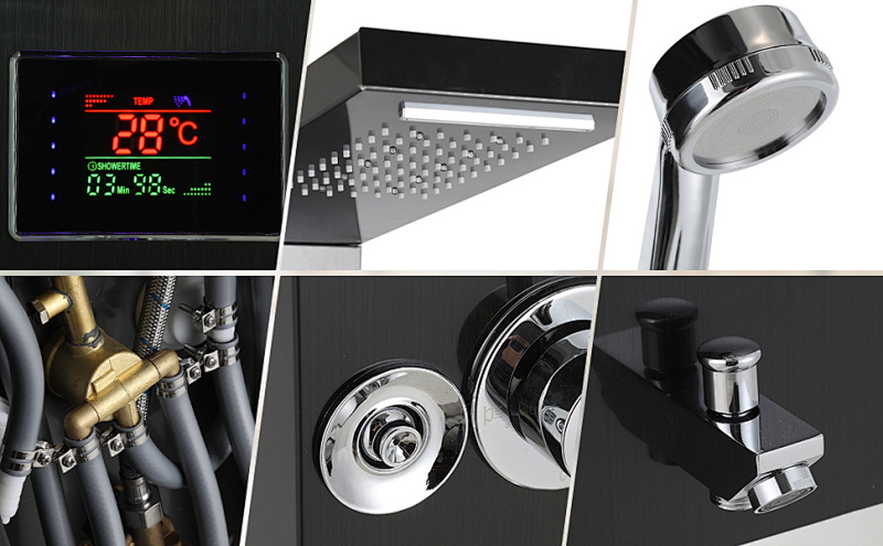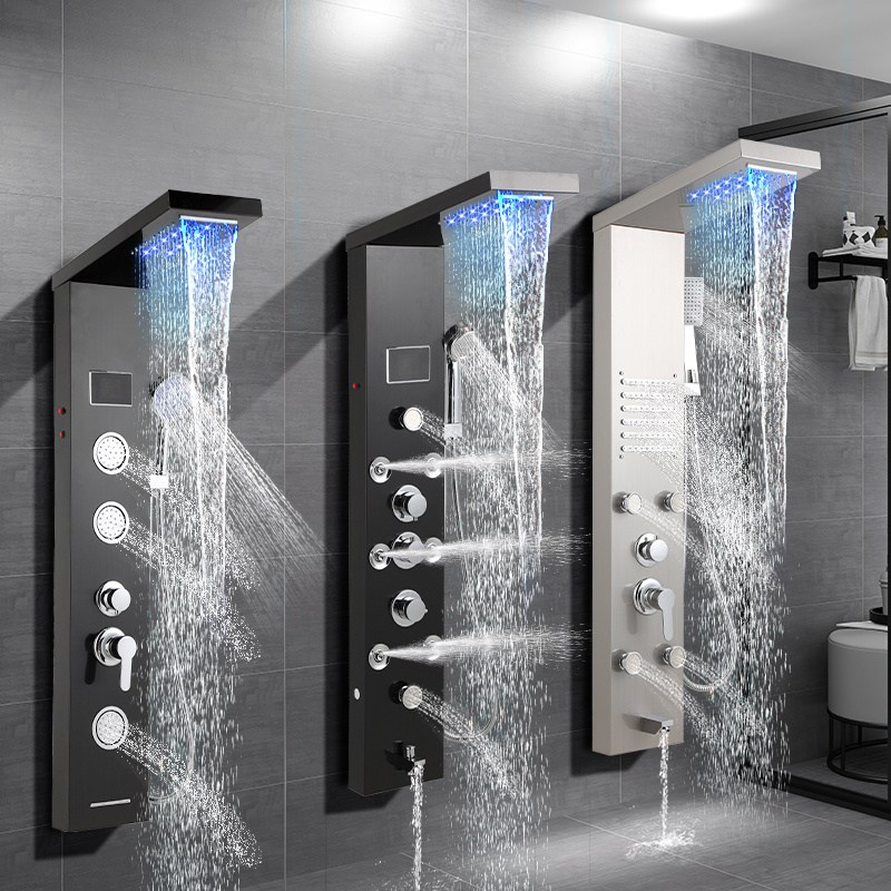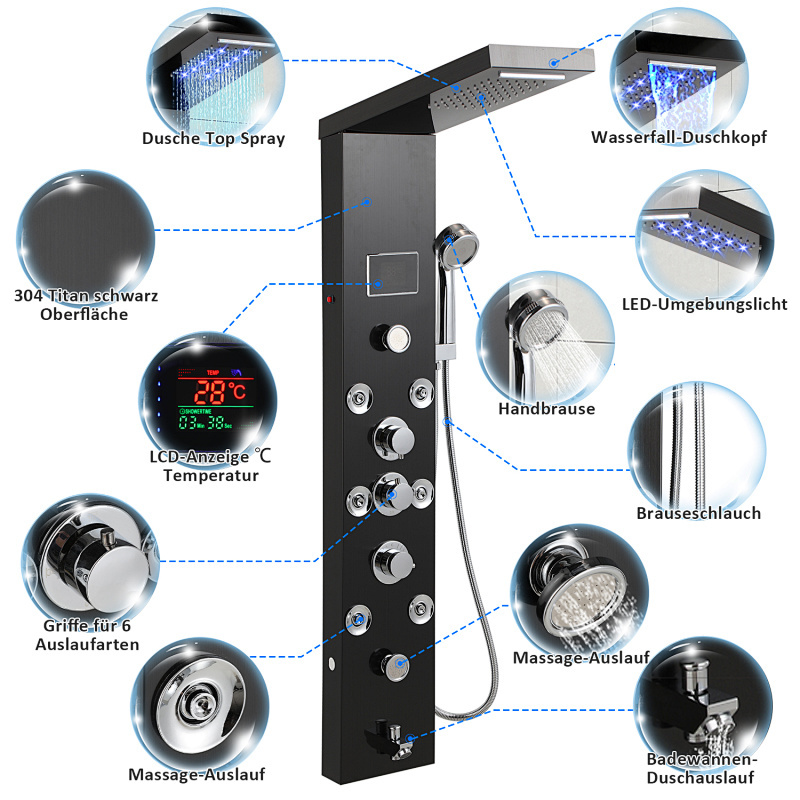 Mit Regenduschkopf, Wasserfall-Duschkopf, Rückenmassage-Duschkopf, Badewannenabfluss, 1,5 Meter Edelstahl-Handbrause und Temperaturanzeige bietet dieses Duschpaneel eine luxuriöse Dusche, die Körper und Geist entspannt und erfreut.