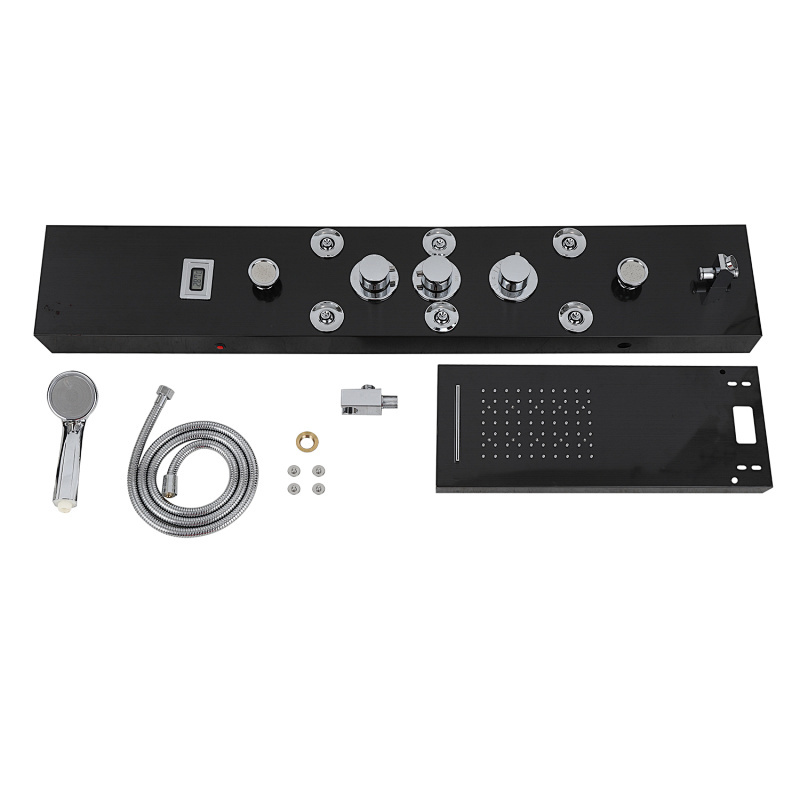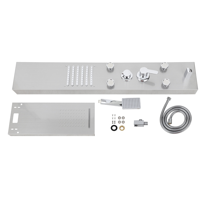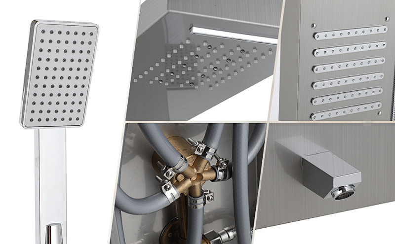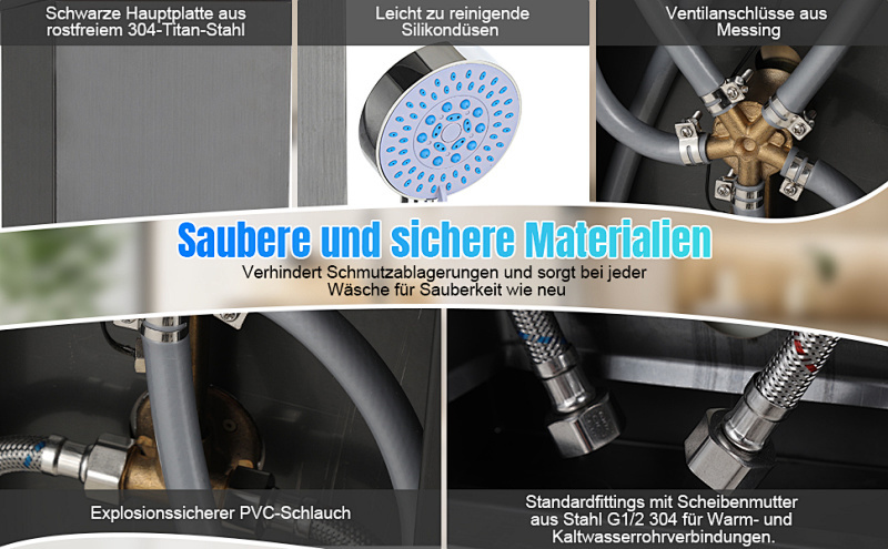 Das Duschpaneel besteht aus einer Hauptplatte aus 304 Edelstahl, während die inneren Ventilanschlüsse aus Messing und die flexiblen Schläuche aus PVC-Explosionsschutzmaterial gefertigt sind. Diese Kombination sorgt für Korrosionsbeständigkeit und Rostschutz und gewährleistet gleichzeitig ein hochwertiges Duscherlebnis im modernen Design.