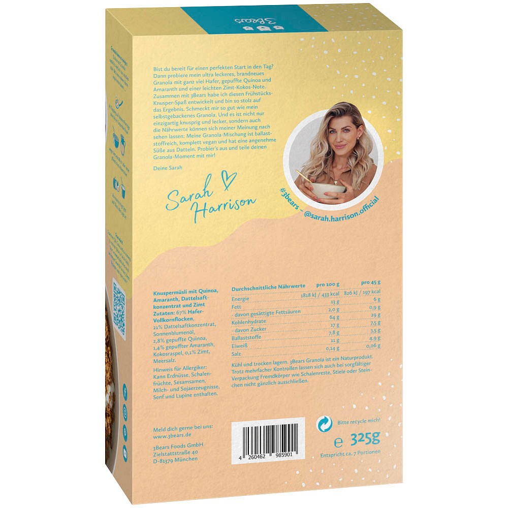 Genießen Sie eine exquisite Mischung mit dem 3Bears Granola - Hafer-Crunch Sarah Harrison Müsli 325,0 g.