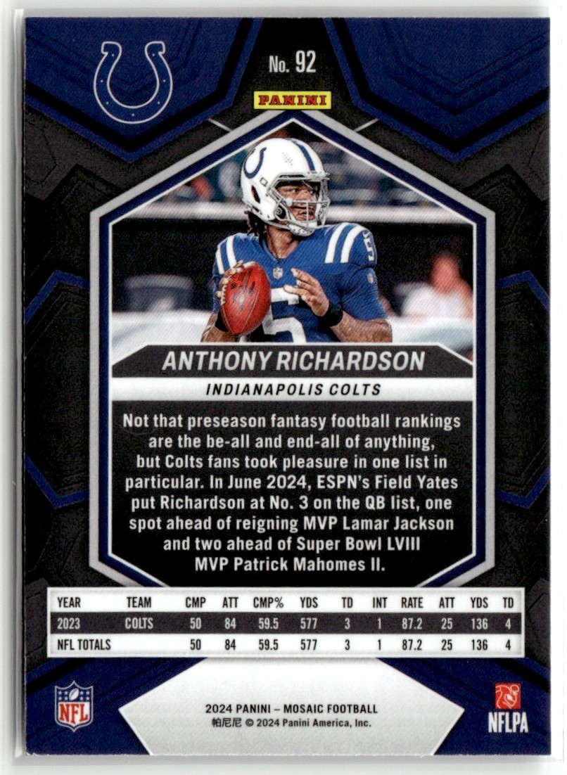 | 2024 PANINI MOSAIC ANTHONY RICHARDSON INDIANAPOLIS COLTS #92 |