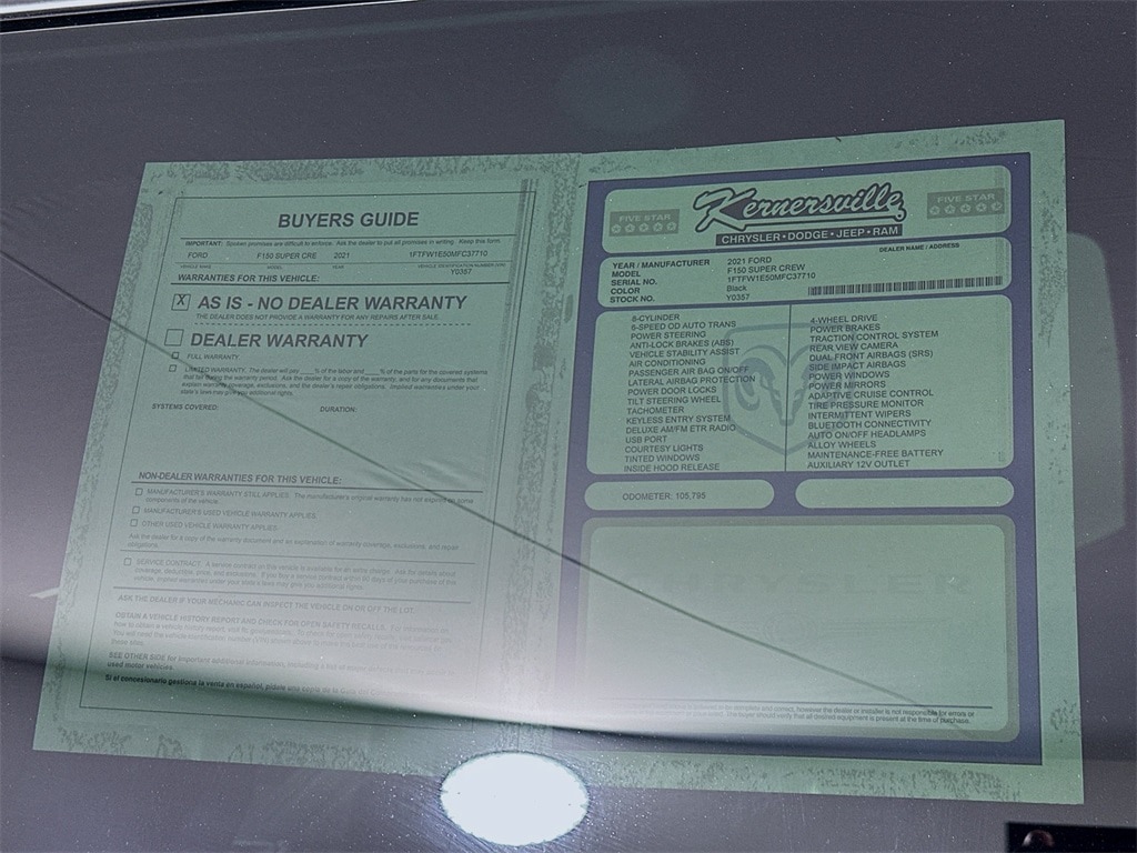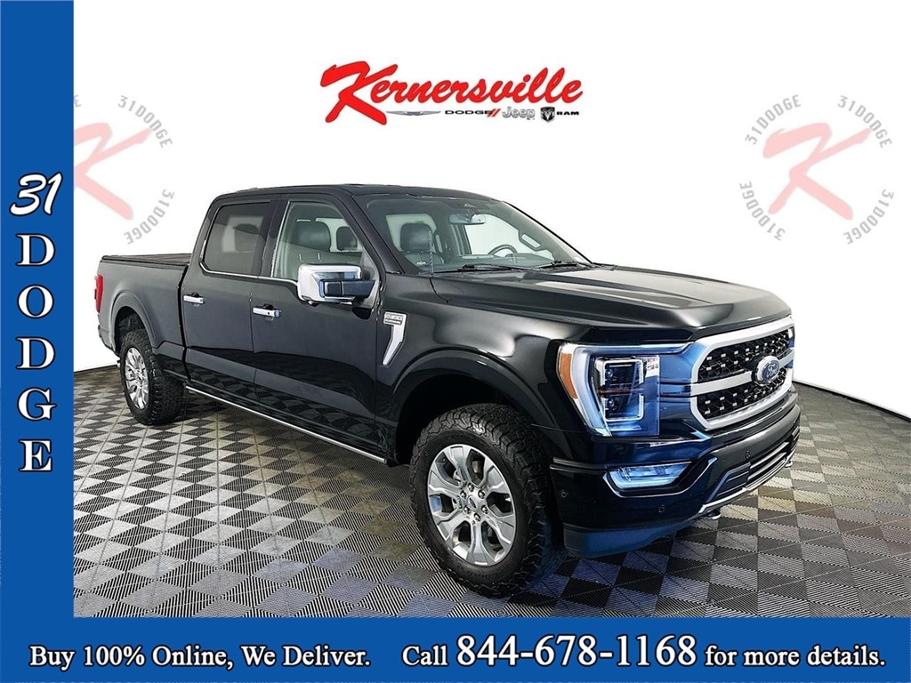 When calling or emailing, please reference stock number Y0357.MORE ABOUT THIS 2021 Ford F-150 Platinum Truck Crew Cab Clean Carfax! Platinum Trim! 5.0L V8 Engine! 10 Speed Automatic Transmission! Four Wheel Drive! 360 Degree Camera! Adaptive Cruise Control! Blind Spot Monitoring! Lane Keeping Assist! Forward Collision Warning! Automatic High Beam Headlamps! Power Tailgate! Trailer Brake Controller! Integrated Trailer Hitch! Remote Start! Leather Bucket Seats! Heated And Ventilated Front Seats! Heated Steering Wheel! Dual Zone Automatic Climate Control! Large Touchscreen Display! Apple CarPlay! Android Auto! Premium Audio System! Power Adjustable Pedals! Power Sliding Rear Window! This 2021 Ford F-150 Platinum delivers premium capability and refined comfort in a full size pickup built for work and everyday driving. Powered by a strong 5.0L V8 engine paired with a smooth 10 speed automatic transmission, it provides confident performance with four wheel drive traction for a variety of road and jobsite conditions. Advanced safety and driver assistance features include adaptive cruise control, blind spot monitoring, lane keeping assist, forward collision warning, automatic high beam headlamps, and a 360 degree camera for added confidence when maneuvering or towing. The upscale interior offers leather seating with heated and ventilated front seats, a heated steering wheel, dual zone automatic climate control, a large touchscreen display with Apple CarPlay and Android Auto, premium audio, power adjustable pedals, and thoughtful storage throughout the cabin. Exterior highlights include a power tailgate, integrated trailer hitch, trailer brake controller, and power sliding rear window, making this F-150 Platinum a versatile and luxurious truck ready for work, travel, and daily use. Kernersville Chrysler Dodge Jeep Ram is the LARGEST truck dealer in the Southeast for two years in a row. We have the largest selection of trucks and over 1900 vehicles in stock at all times. We aim to truly be the lowest priced in the market and we do so by price checking our inventory every day and dropping our price to remain in the TOP 3 LOWEST PRICED. Shop at the most convenient dealer in the USA, available online! Shop at Kernersville Chrysler Dodge Jeep Ram! Hablamos Espanol - llame hoy.