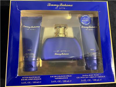 Here is a Tommy Bahama St. Kitts gift set which is new in box. The set comes with a 3.4 oz cologne spray, 3.4 oz after shave balm and a 3.4 oz hair and body wash.