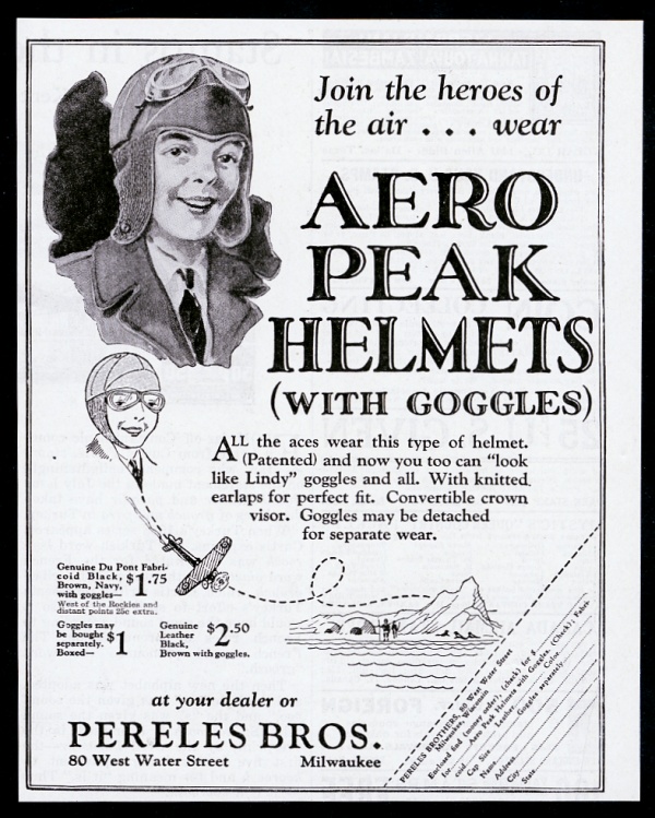 1929 Aero Peak kids toy pilot helmet with goggles illustrated vintage print ad