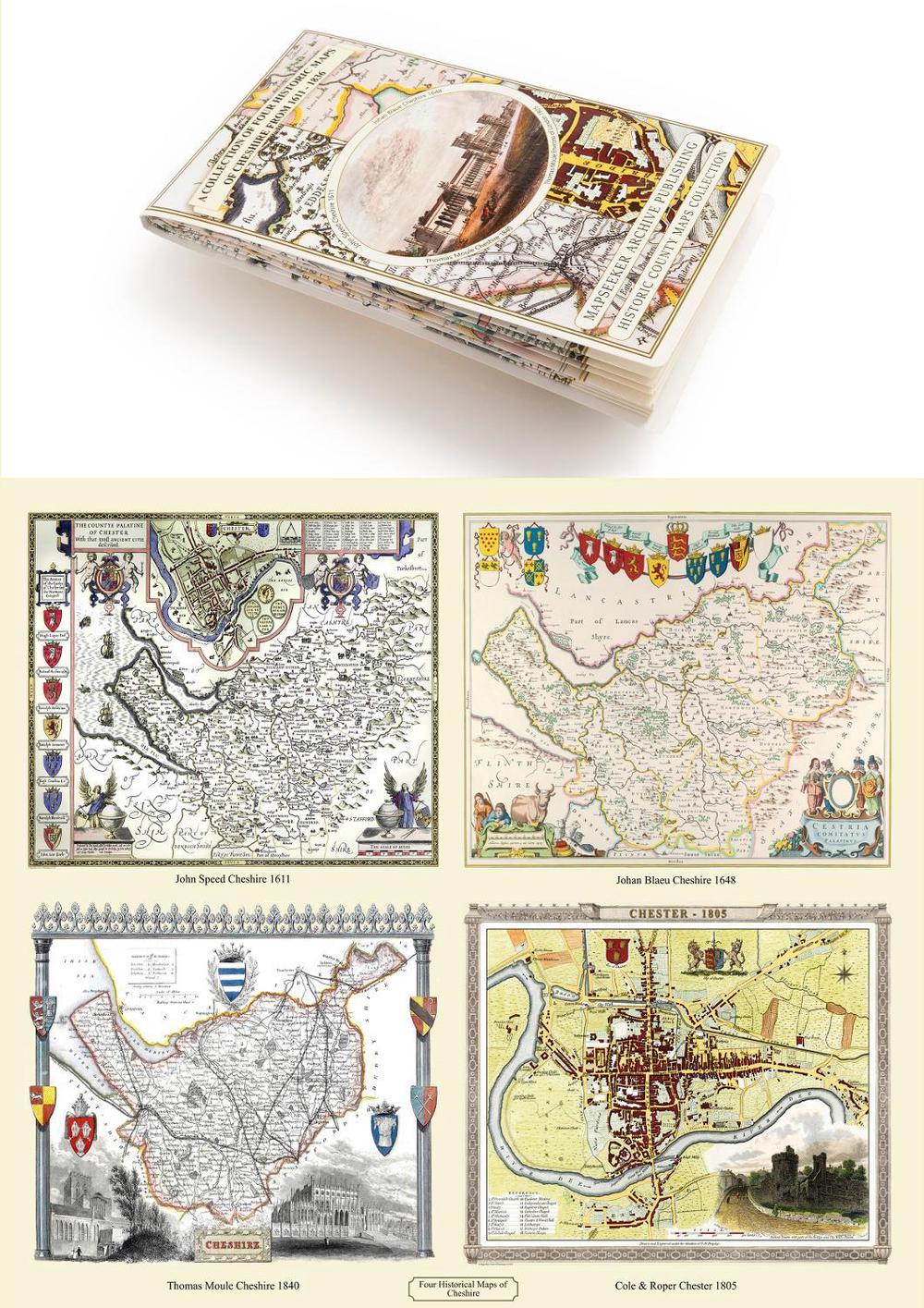 A Cheshire 1611 1840 Fold Up Map that features a collection of Four Historic Maps, John Speeds County Map 1611, Johan Blaeus County Map of 1648, Thomas Moules County Map of 1840 and Cole and Ropers Plan of the City of Chester 1805.