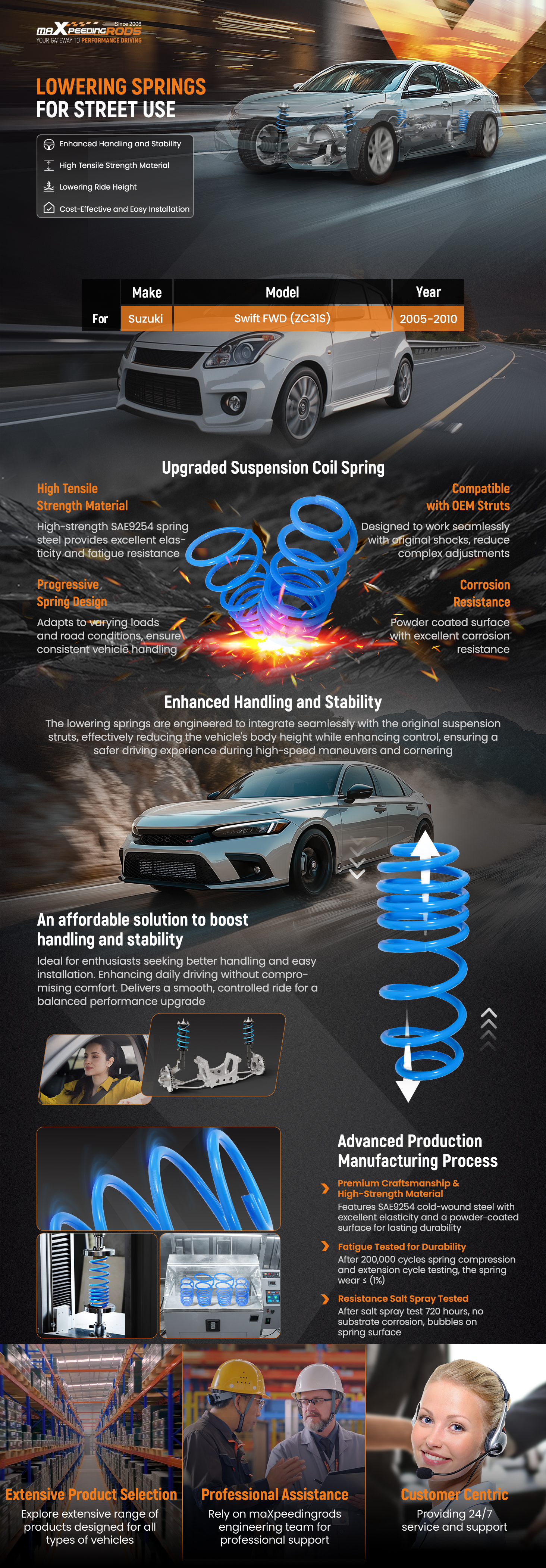 Cada muelle está diseñado por expertos para adaptarse al peso y la dinámica específicos de su vehículo, garantizando una maniobrabilidad y comodidad óptimas.