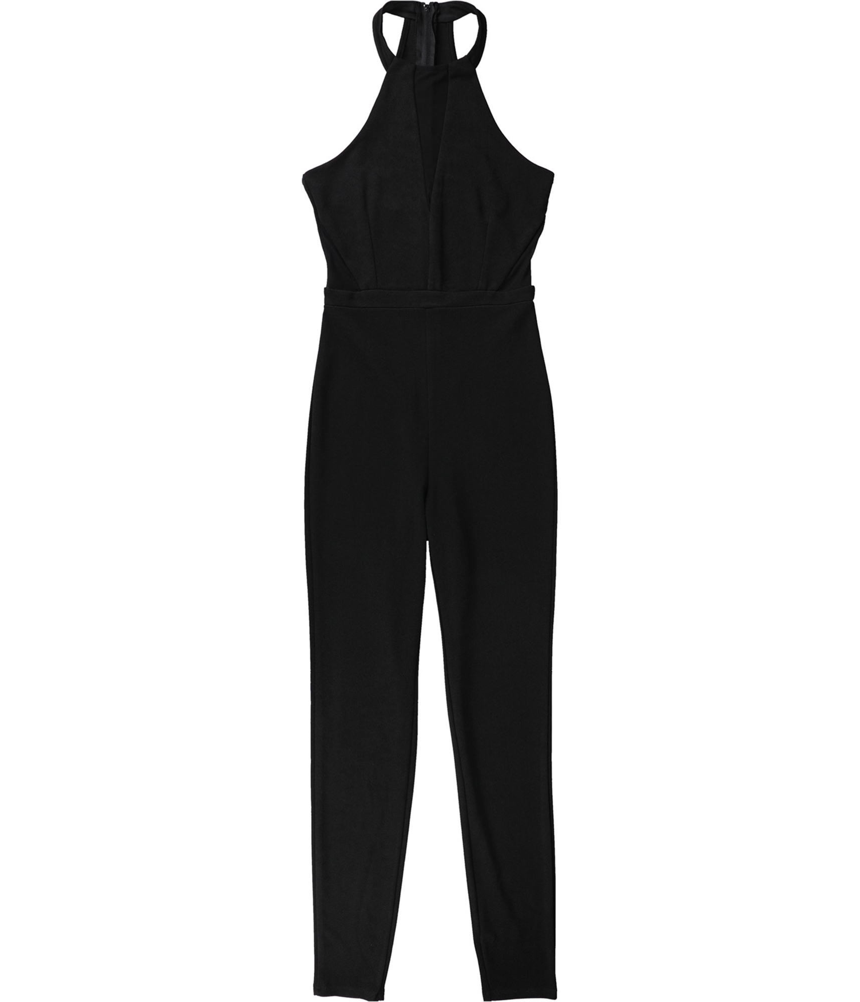 Step out in sophisticated style with this striking jumpsuit, designed for the modern woman who commands attention. A daring high neckline with a plunging V-front creates a captivating silhouette, while the sleeveless cut and cinched waist emphasize your form. The smooth, medium-weight knit drapes beautifully, offering a flattering and comfortable fit perfect for any occasion, from a chic evening out to a sophisticated daytime event. The back zipper ensures a seamless and polished finish, making this a go-to piece for effortless elegance.