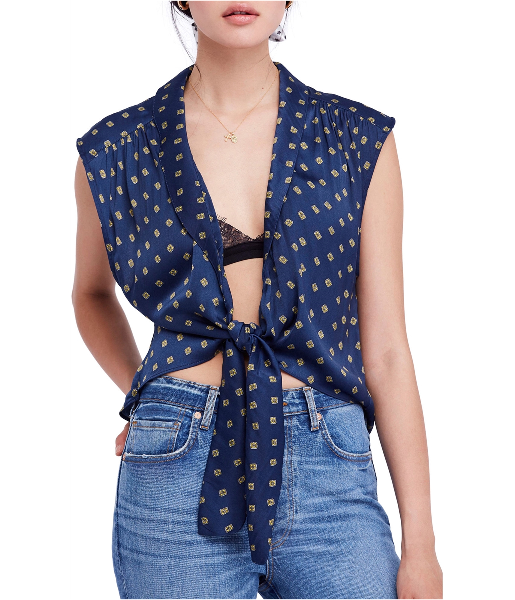 Free People Womens Printed Tie Front Sleeveless Blouse Top, bluecombo, M