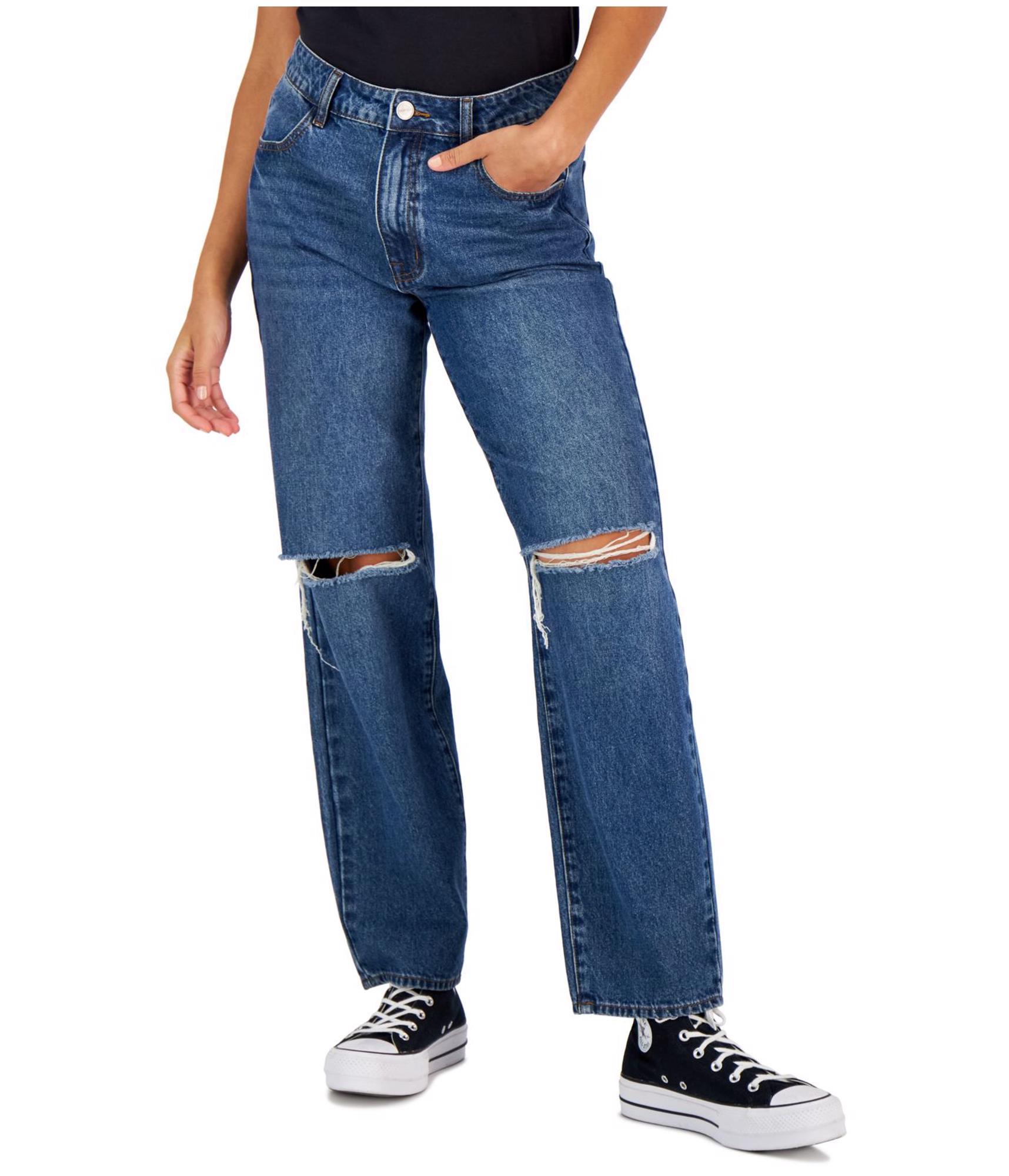 Dollhouse Womens Ripped Knee High Rise Dad Relaxed Fit Jeans, medblue, Juniors, 9