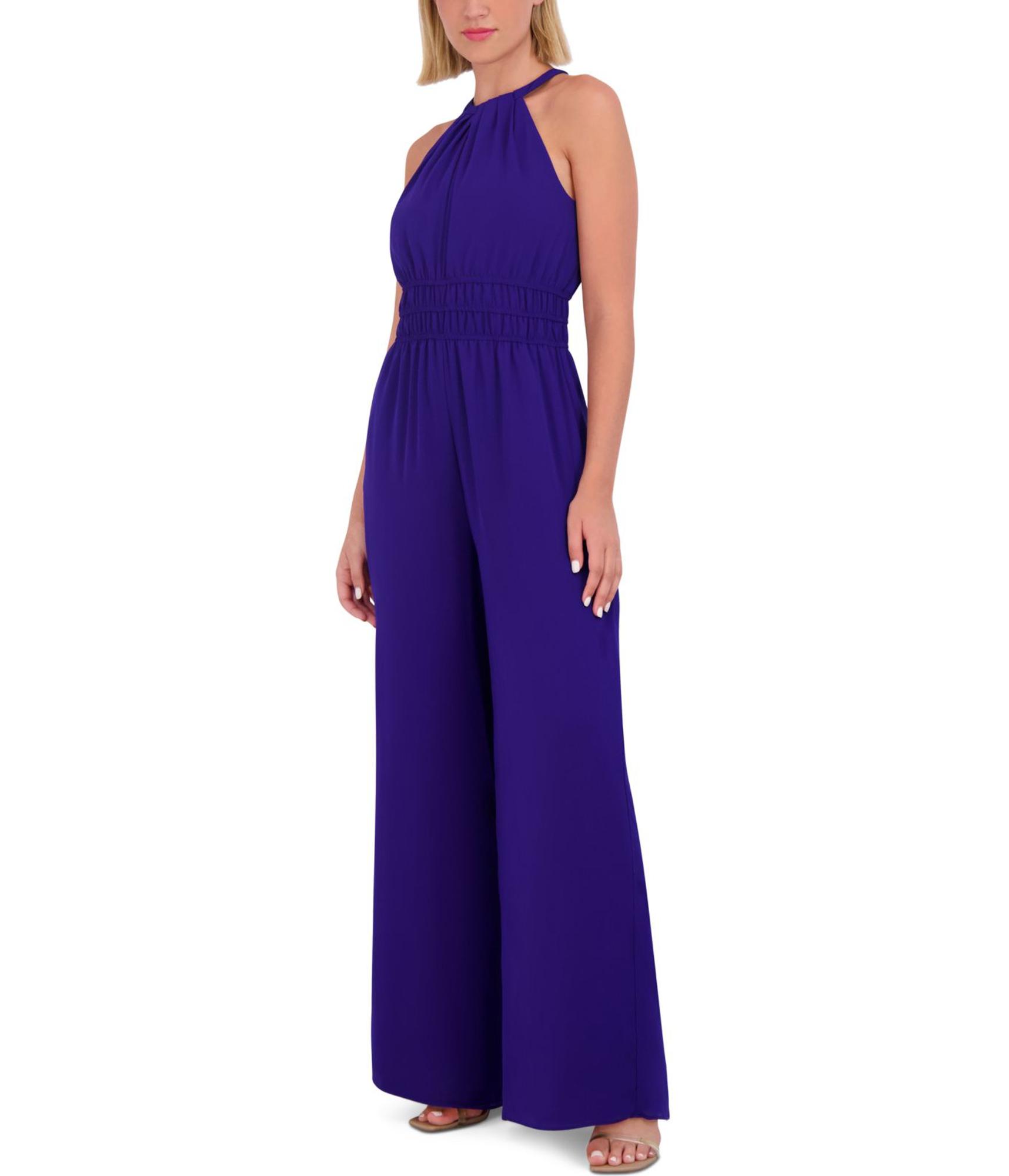 Effortless elegance defines this Vince Camuto jumpsuit, designed for the modern woman on the go. The flowing chiffon fabric drapes beautifully, creating a silhouette that's both sophisticated and comfortable. A flattering halter neckline draws the eye upward, while the smocked waist cinches to accentuate your figure before cascading into wide, flowing legs that move with every step. This sleeveless design is perfect for warmer days or as a base for layering. Imagine stepping out for a casual brunch or an evening gathering, feeling chic and put-together in this versatile piece.