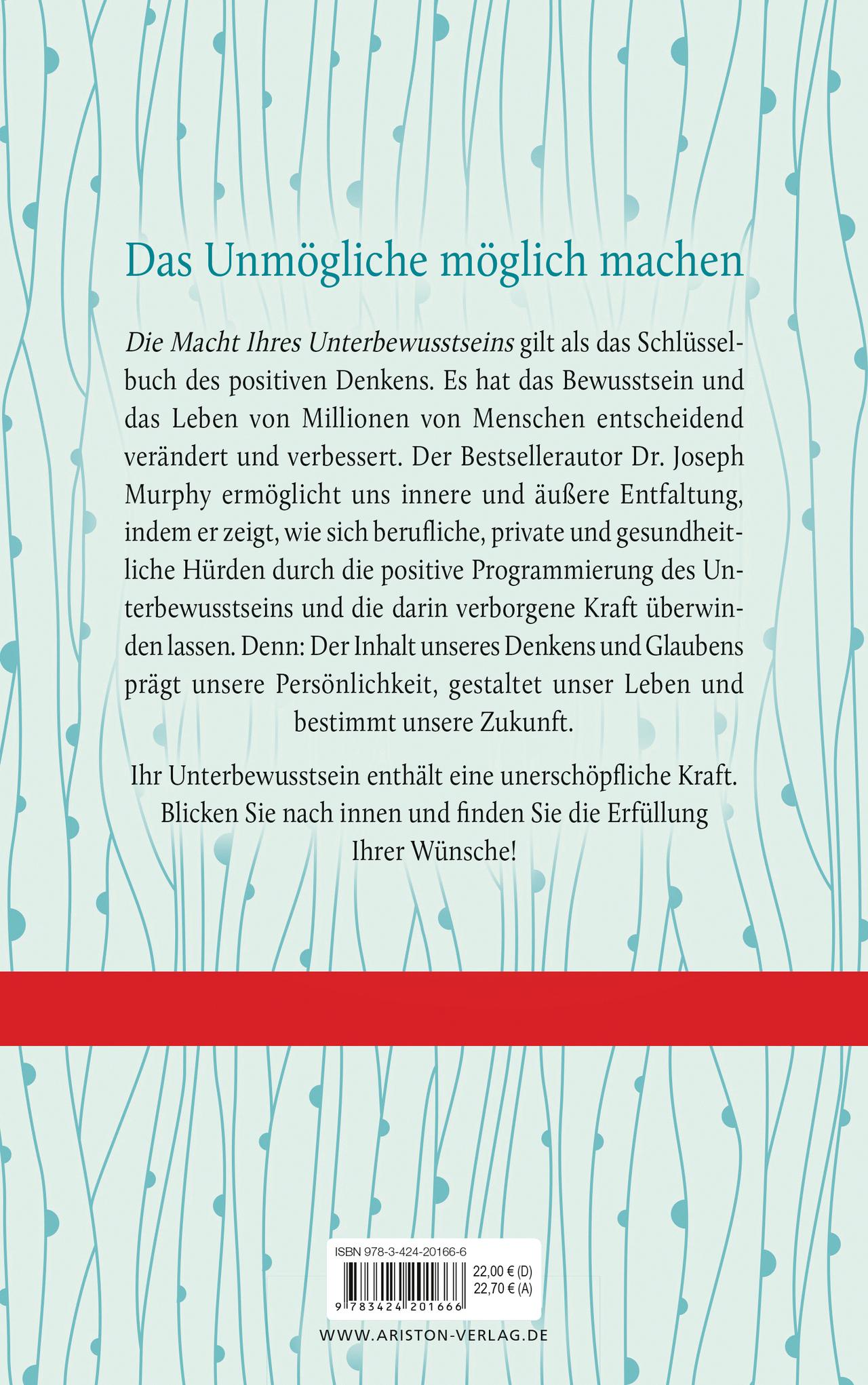 Dr. Joseph Murphy gilt als Wegbereiter des positiven Denkens, seine Bücher haben sich millionenfach verkauft. Sein vor 50 Jahren erschienener Weltbestseller Die Macht Ihres Unterbewusstseins hat bis heute nichts an Aktualität verloren. Denn unser Unterbewusstsein ist weitaus mächtiger, als wir annehmen - in ihm liegt der Schlüssel zum Glück. Unsere eigenen Gedanken entscheiden über Erfolg oder Niederlage, und nur wer in der Lage ist, sein Unterbewusstsein positiv zu beeinflussen, kann Schwächen in Stärken umwandeln und Herausforderungen mit Zuversicht meistern.