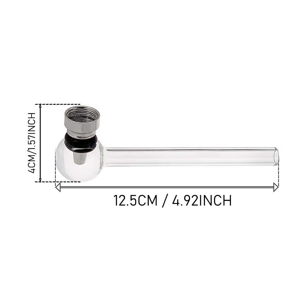Small 12.5cm/5inch glass pipe. It features a transparent straight stem and a transparent ball bowl. This is topped with a stainless steel bowl with a gasket and screen.