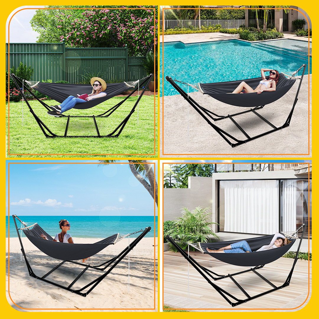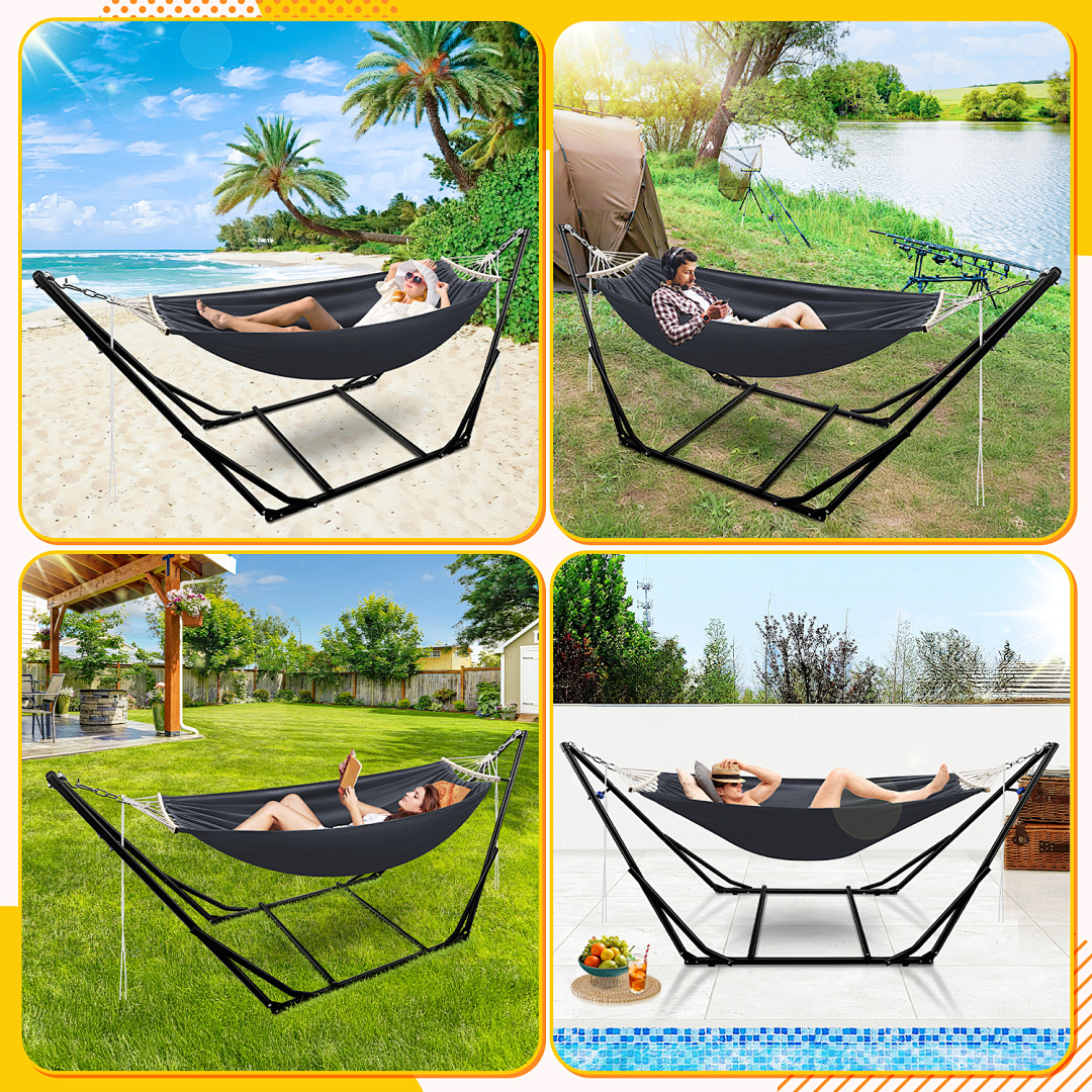 Das Gestell kommt vollständig vormontiert an. Einfach ausklappen, die Hängematte einhängen und entspannen! Dank des cleveren Faltdesigns ist das Set nach Gebrauch ebenso schnell wieder platzsparend verstaut und leicht zu transportieren.