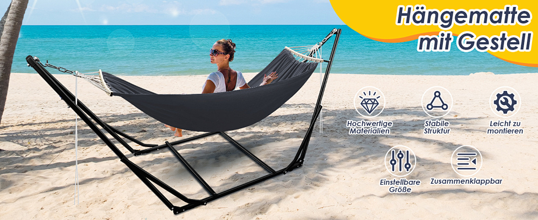 Genießen Sie Entspannung ohne Aufwand – jederzeit und überall! Unsere faltbare Hängematte mit eigenem Gestell ist sofort einsatzbereit und schafft im Handumdrehen Ihre persönliche Wohlfühloase im Garten, auf dem Balkon oder unterwegs.