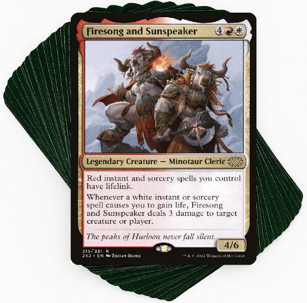 Built around noncreature spells that deal damage or gain life to fully utilize Firesong and Sunspeaker’s abilities.