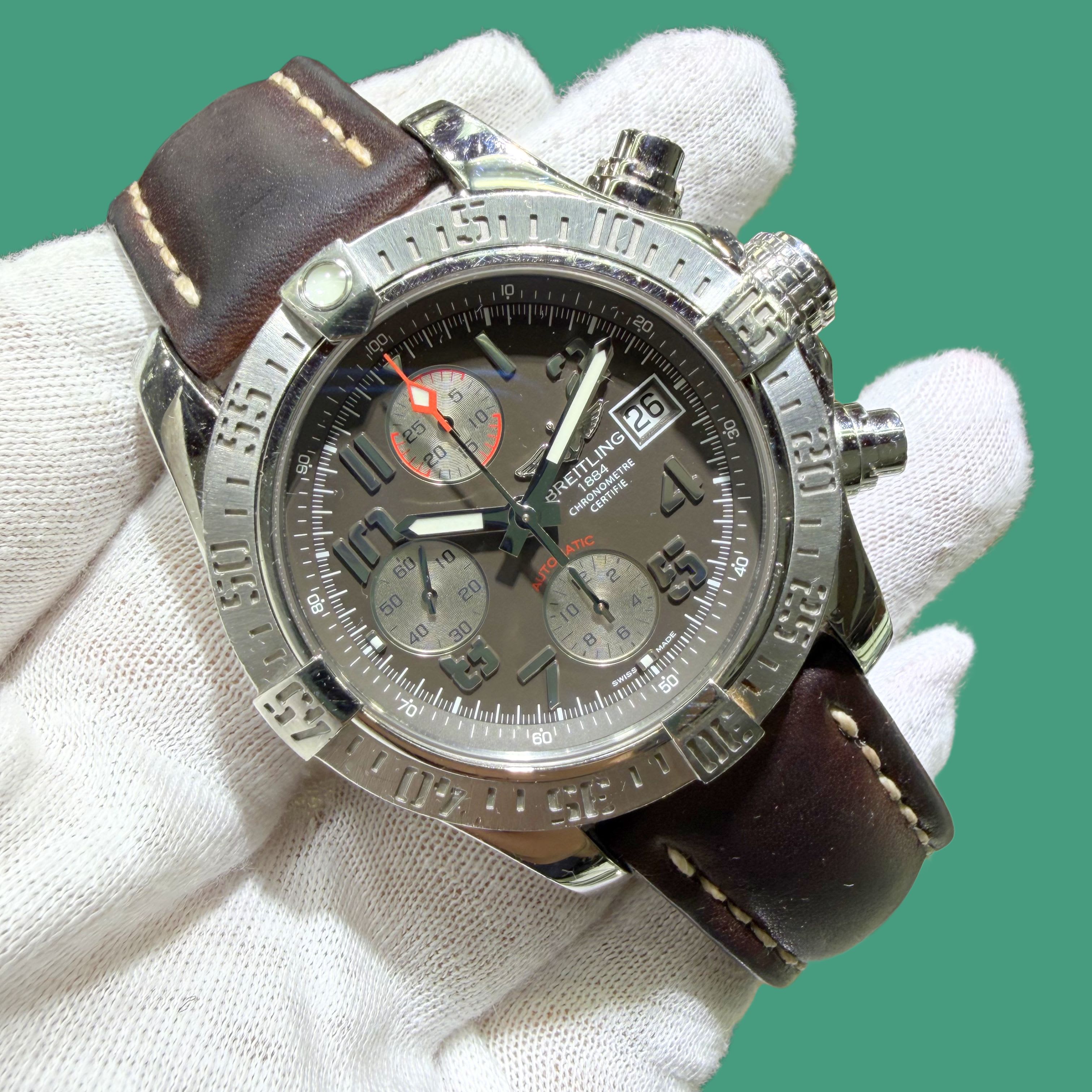 Breitling Avenger II men's chronograph, reference A13381111B1A1, built to embody power and precision. This robust 43mm stainless steel timepiece features a striking grey dial with luminous Arabic numerals for superior readability in any condition. This example shows wear throughout consistent with regular use. Currently fitted on a leather strap, with an additional leather strap included. Inner box included; papers not available.