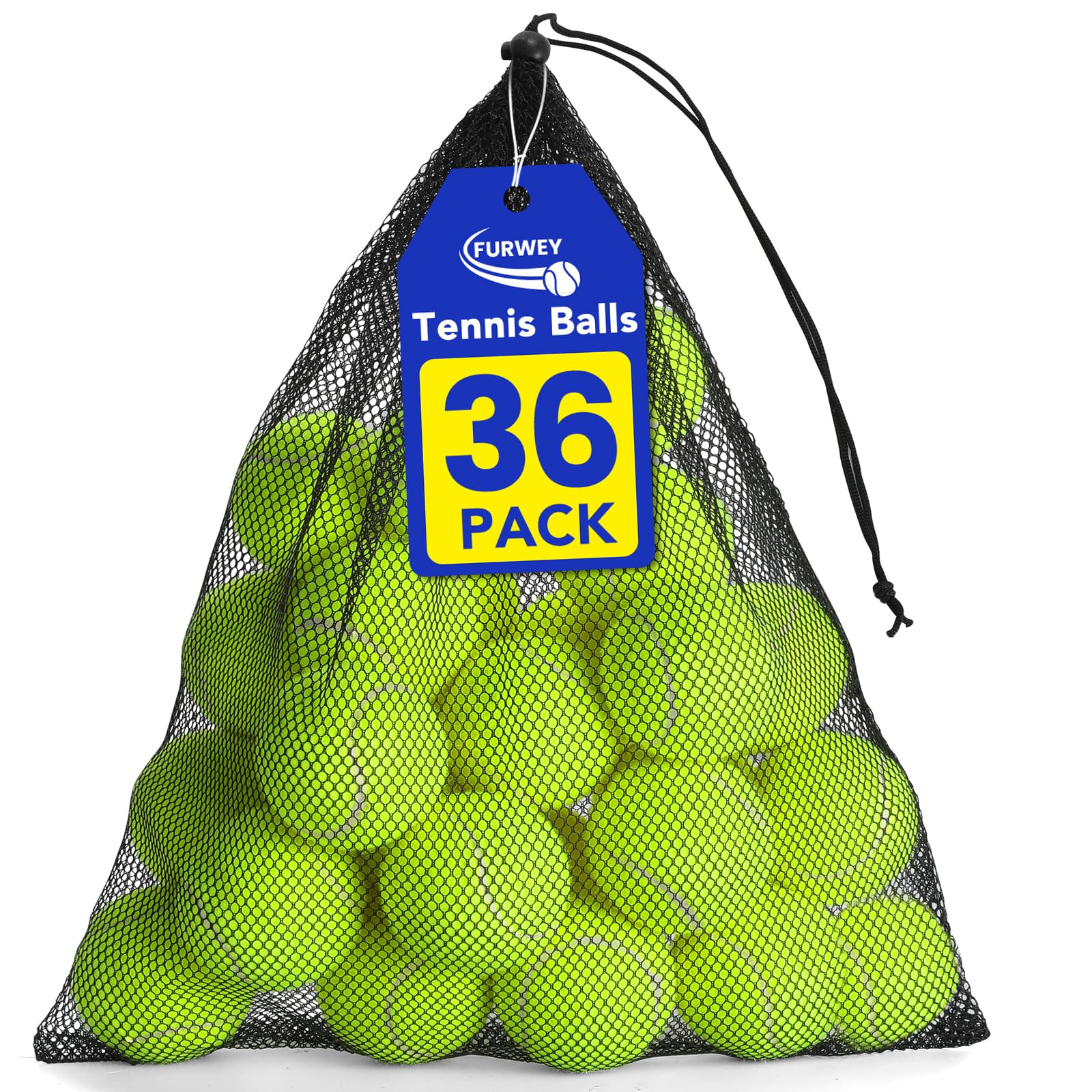 Package includes 36 tennis balls and a reusable net bag. The bag opening has a drawstring closure, making it convenient for carrying and storage