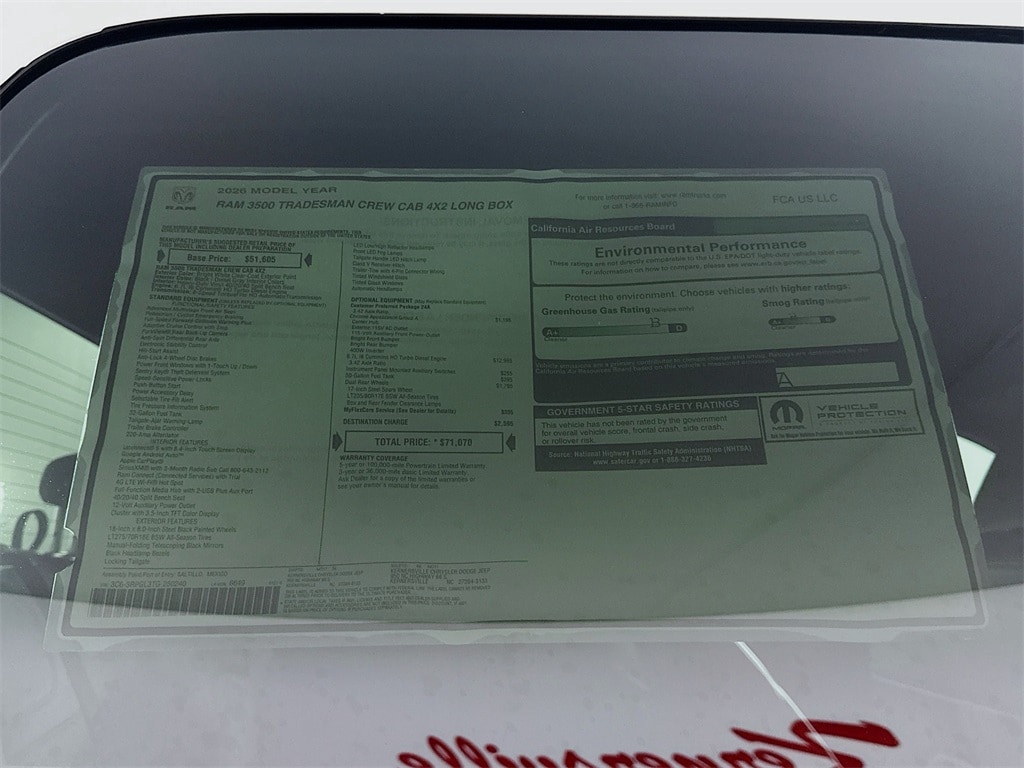 MORE ABOUT THIS 2026 Ram 3500 Tradesman Dually Truck Crew Cab LB BACKUP CAMERA! This 2026 RAM 3500 TRADESMAN CREW CAB 4X2 LONG BOX Truck includes the following features: Package: , Exterior Color: Bright White Clear Coat Exterior Paint Interior Color: Black / Diesel Gray Interior Colors Interior: Heavy Duty Vinyl 40/20/40 Split Bench Seat Engine: 6.7L I6 Cummins HO Turbo Diesel Engine Transmission: 8 Speed TorqueFlite HD Automatic Transmission Uconnect 5 with 8.4 Inch Touch Screen Display Adaptive Cruise Control with Stop ParkView Rear Back Up Camera Sentry Key Theft Deterrent System Push Button Start Google Android Auto Apple CarPlay As well as the following options: 6.7L I6 Cummins HO Turbo Diesel Engine Instrument Panel Mounted Auxiliary Switches 50 Gallon Fuel Tank Dual Rear Wheels 17 Inch Steel Spare Wheel and much more! Please check the window sticker for a complete list of equipment. Kernersville Chrysler Dodge Jeep Ram in Kernersville, NC is located in the heart of North Carolina between Charlotte, NC and Raleigh, NC. We specialize in NO hassle out of state purchases we process your taxes, tags and title work for the city and state where the vehicle will be registered. RETURN TO TOP