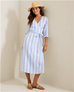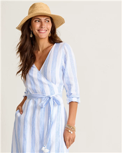 Defined by its flattering wrap silhouette, classic nautical-inspired stripes, and effortless drape, this airy linen dress is perfect for getaway wardrobes and beyond.
