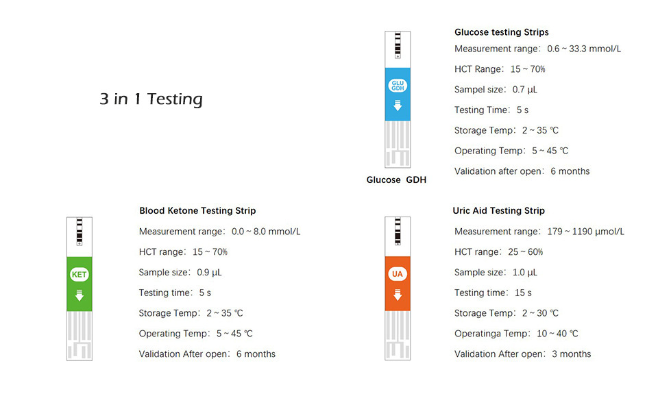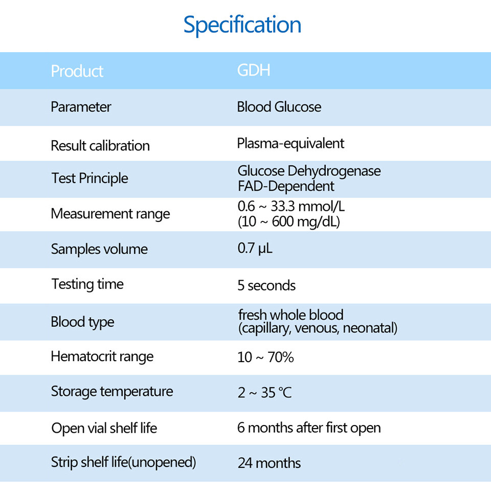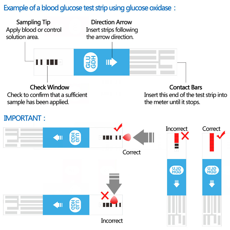 [ 8-Electrode Test strips ] New enzyme chemistry, High accuracy and Anti-interference, Wide HCT range, Hematocrit Interference Compensation, Wide operating temperature. Auto Test Strip Type Recognitions.