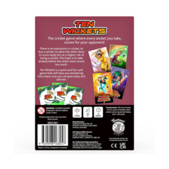 Ten Wickets is a two-player auction game that is lightly themed on Cricket. Each wicket in Ten Wickets is an auction, where, whenever you win that auction, your opponent scores your winning bid while losing an end game bonus. This immediate gain and long term loss keeps the tension in the game until the last wicket falls. The game ends when one player takes Ten Wickets and the player with the highest score wins.